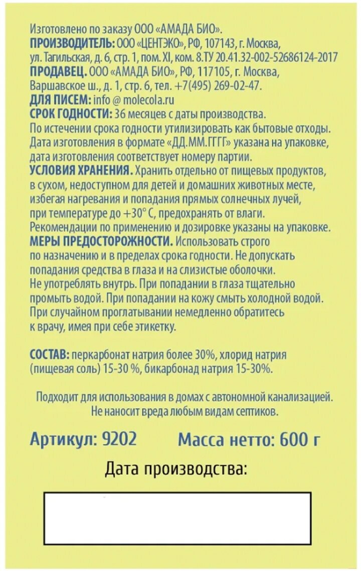 Molecola отбеливатель универсальный экологичный 600 г картонная пачка