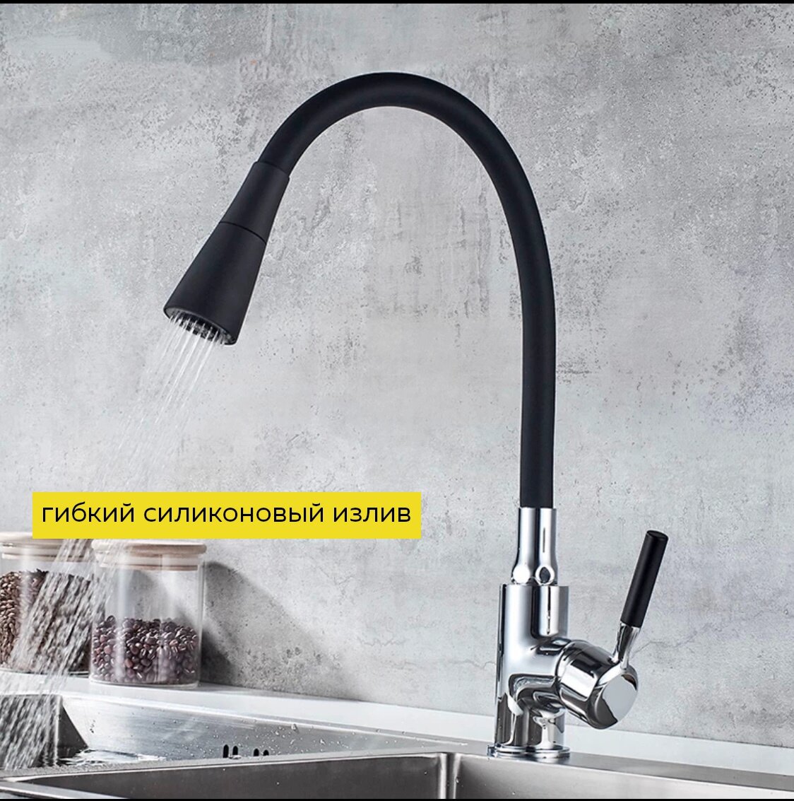 Смеситель для кухни с силиконовым изливом, чёрный