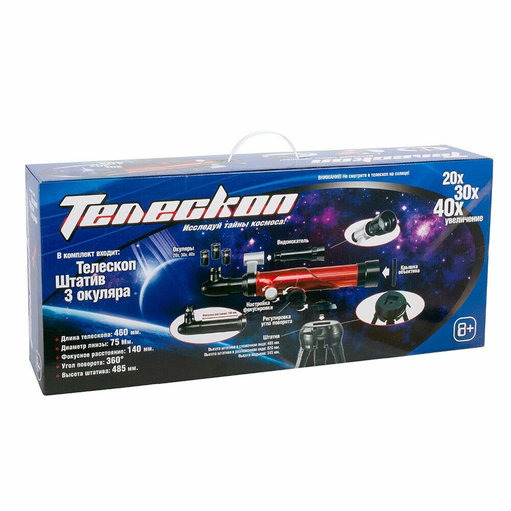 | Дополнительная информация | характеристики телескопа: диаметр объектива: 50 мм; фокусное расстояние: 170 мм; характеристики микроскопа: 3 объектива: 100 х, 200 х, 450 х; точная фокусировка; зеркальце |