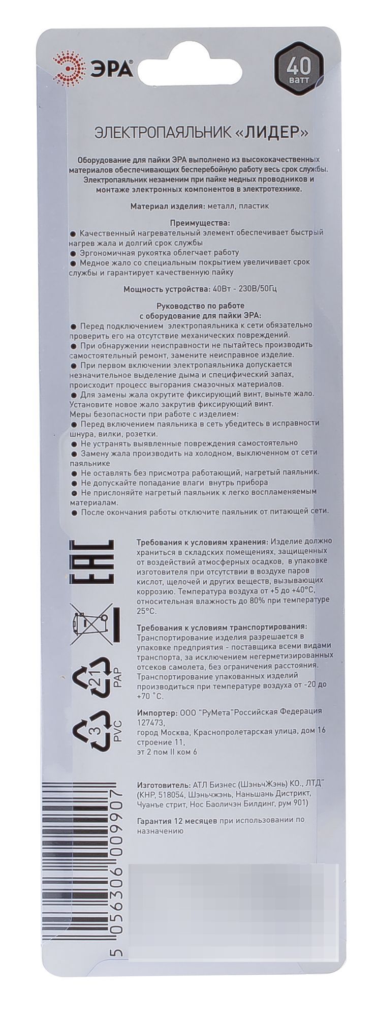 PL-02-30 W Эра Паяльник "Лидер" с 2-комп. рукоятка, жало Long life 230 В 30 Вт (100/800)