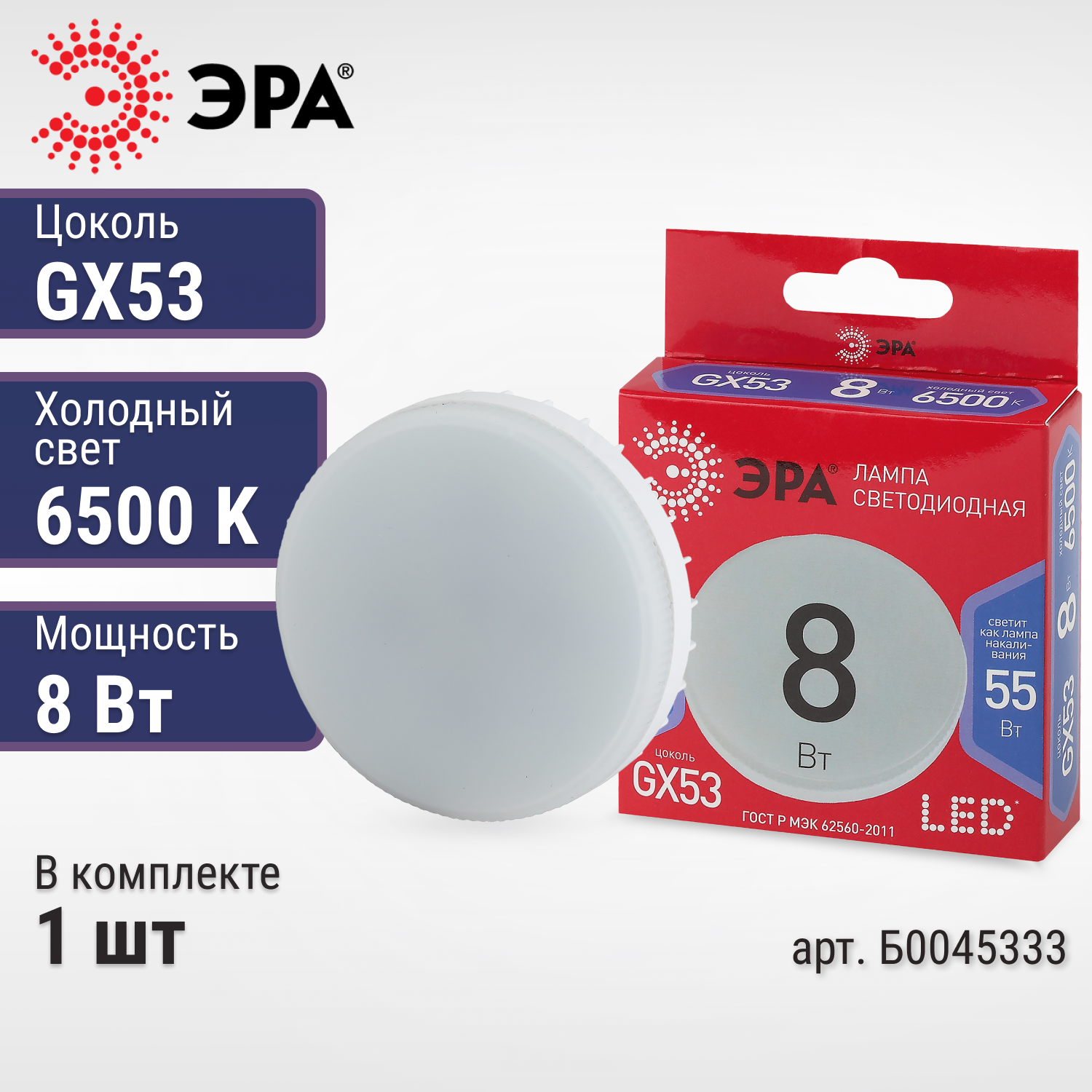 Купить Лампа светодиодная GX53 ЭРА Таблетка, 8Вт, 6500К, лампочка 1 шт. Б0045333