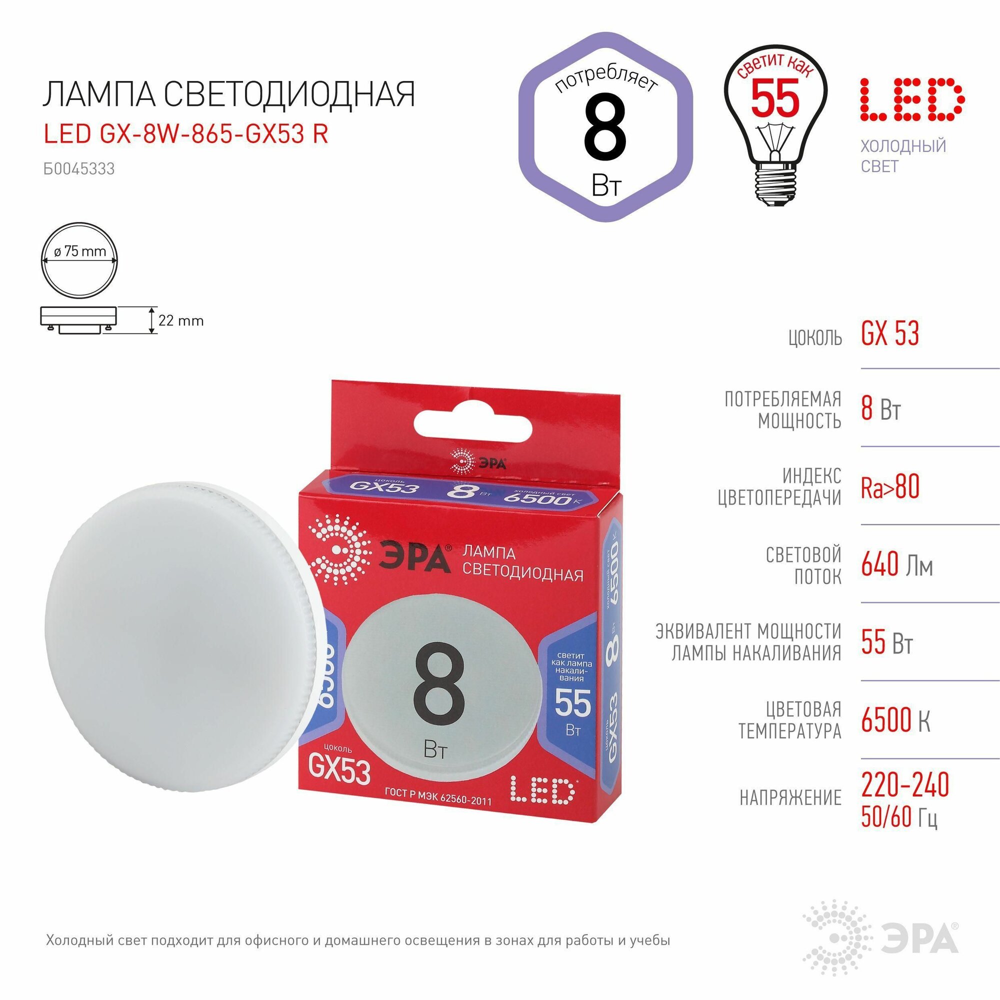 (5 шт.) Светодиодная лампочка ЭРА ECO GX53 8W(640lm) 6500K 6K 22х75 GX-8W-865-GX53 5642 Холодный белый. Цоколь GX53