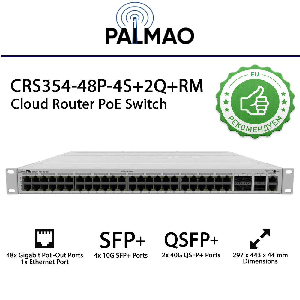 СохранитьУправляемый коммутатор для рабочих групп MikroTik Коммутатор MikroTik Cloud Router Switch 354-48P-4S+2Q+RM with 48 x Gigabit RJ45 LAN (all PoE-out), 4 x 10G SFP+ cages, 2 x 40G QSFP+ cages, RouterOS L5, 1U rackmount enclosure, 750W PSU интересное: