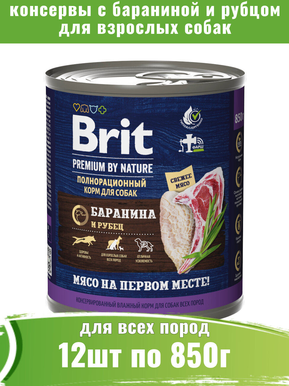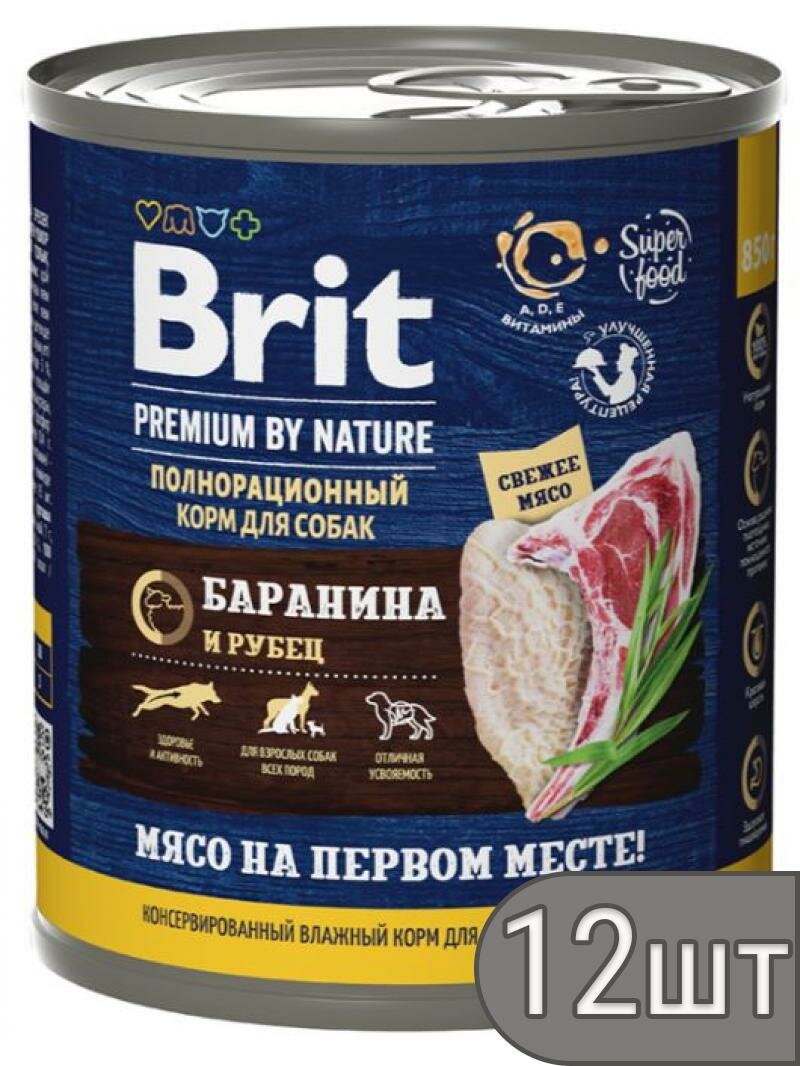 Brit Premium 12шт по 850г с бараниной с рубцом консервы для взрослых собак всех пород