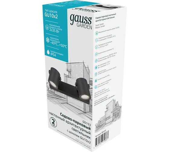 Ниже Вы можете прочитать отзывы на Gauss Светильник садово-парковый Sonata настенный архитектурный, 2xGU10, 280x90x130mm GD153, ознакомится с подробными характеристиками, посмотреть интересные обзоры и фотографии на Gauss Светильник садово-парковый Sonata настенный архитектурный, 2xGU10, 280x90x130mm GD153.