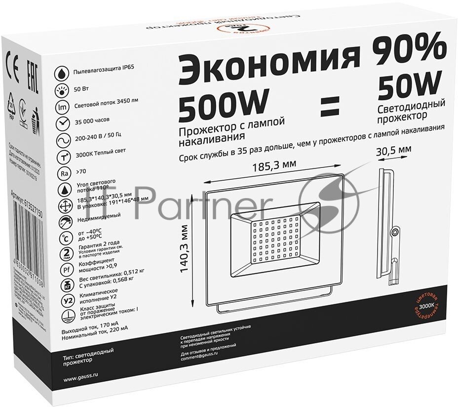 Прожектор уличный GAUSS 613527150, 50Вт