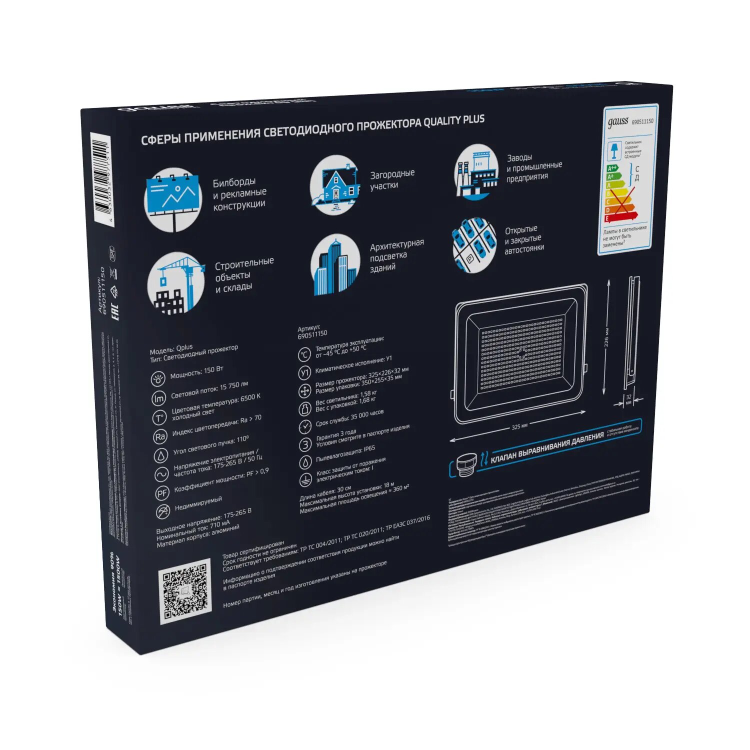 Прожектор светодиодный Gauss Qplus 150W 6500К 690511150