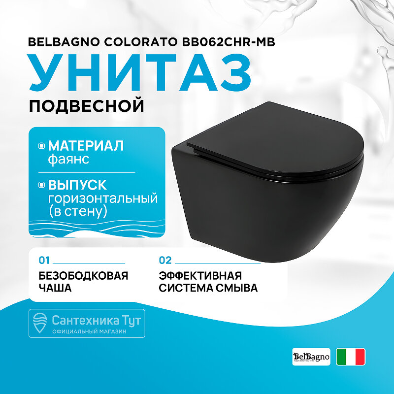 Комплект 4 в 1 Унитаз подвесной BelBagno COLORATO BB062CHR-MB с сиденьем BB062SC-MB + Система инсталляции для унитазов BelBagno BB002-80 с кнопкой смыва BB007-PR-NERO. M