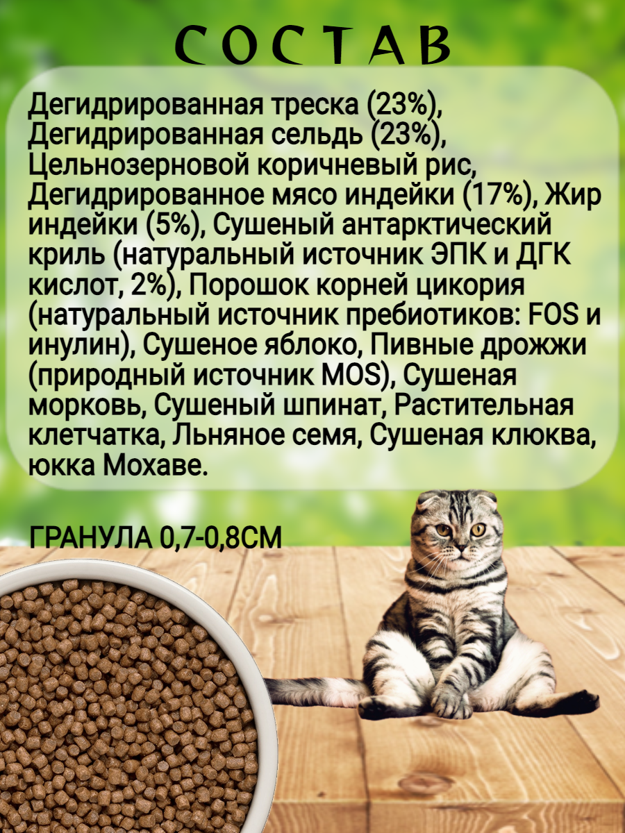 | Состав | Дегидрированная треска (23 %), дегидрированная сельдь (23 %), цельнозерновой коричневый рис, дегидрированное мясо индейки (17 %), жир индейки (5 %), сушеный антарктический криль (натуральный источник ЭПК и ДГК, 2 %), порошок корней цикория (натуральный источник пребиотиков: ФОС и инулин), сушеное яблоко, пивные дрожжи (натуральный источник МОС), сушеная морковь, сушеный шпинат, растительная клетчатка, льняное семя, сушеная клюква, Юкка Мохаве. |
