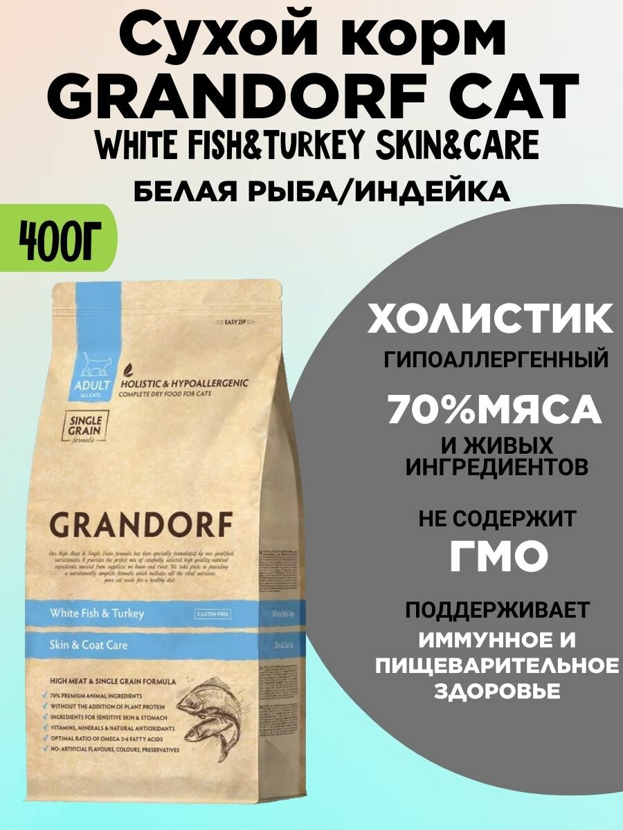 GRANDORF SINGLE GRAIN CAT ADULT SKIN & COAT CARE WHITE FISH & TURKEY низкозерновой для взрослых кошек с чувствительной кожей и шерстью с белой рыбой и индейкой 400 г.