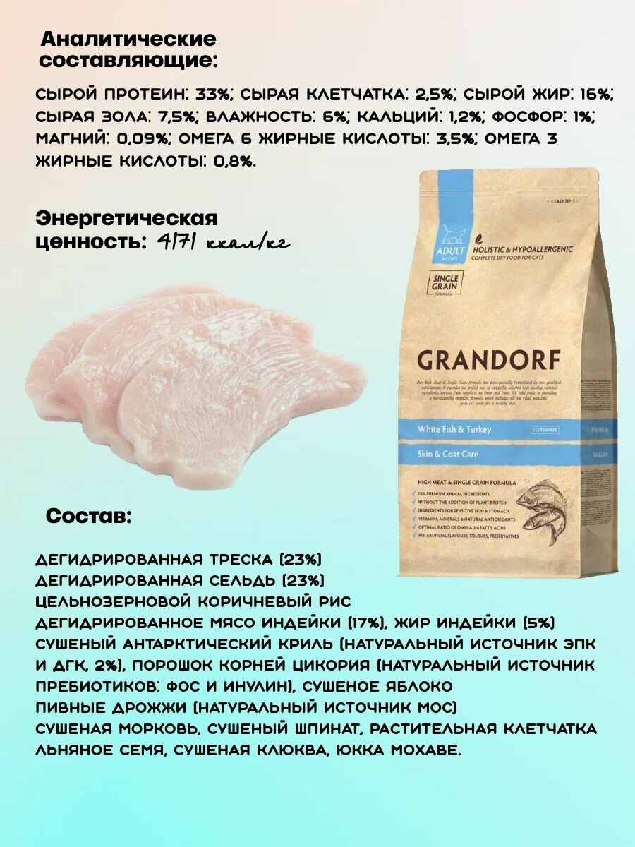 GRANDORF SINGLE GRAIN CAT ADULT SKIN & COAT CARE WHITE FISH & TURKEY низкозерновой для взрослых кошек с чувствительной кожей и шерстью с белой рыбой и индейкой (2 кг)