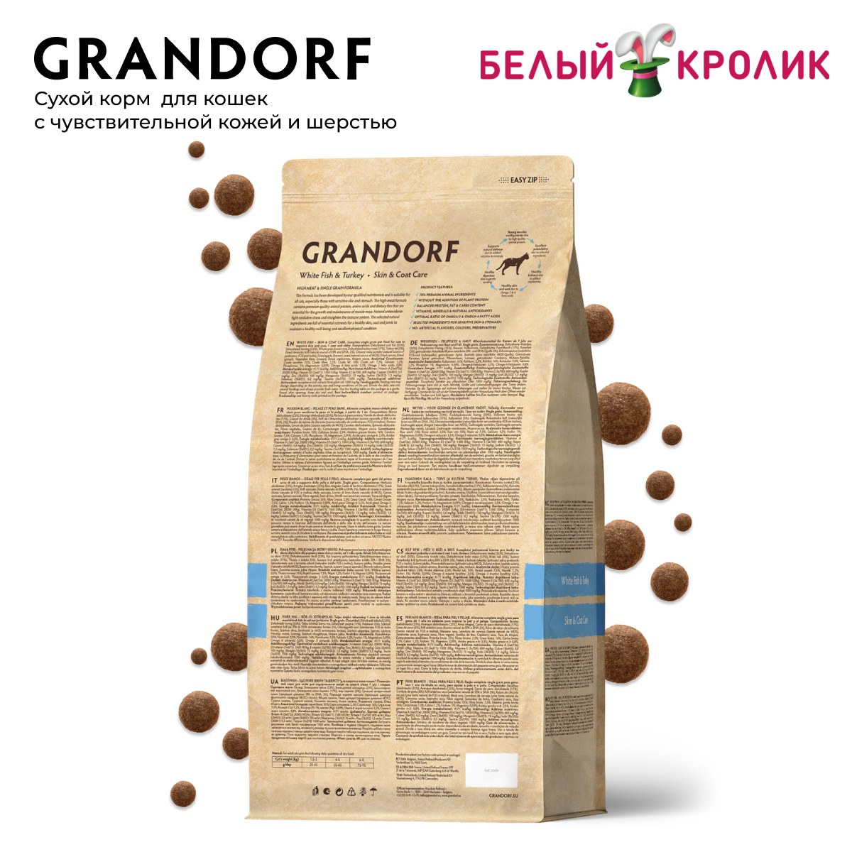 Сухой корм GRANDORF CAT White Fish&Turkey SKIN&CARE (Белая рыба с индейкой - забота о коже и шерсти для кошек) 400 гр.