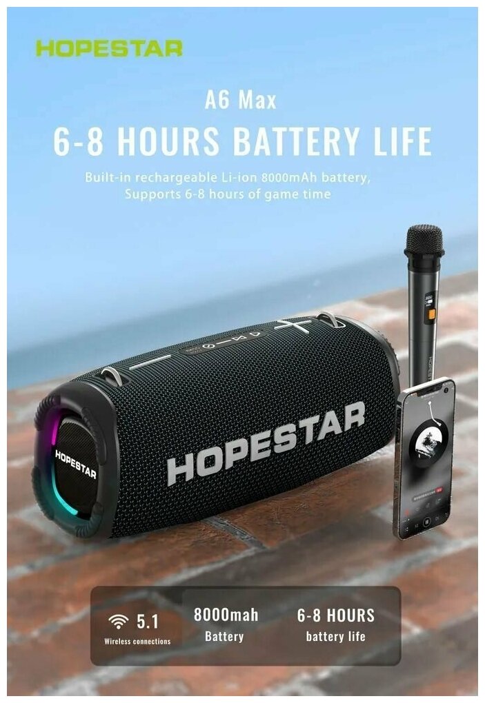 Беспроводная портативная колонка с микрофоном Hopestar A6 MAX чёрная, 80W