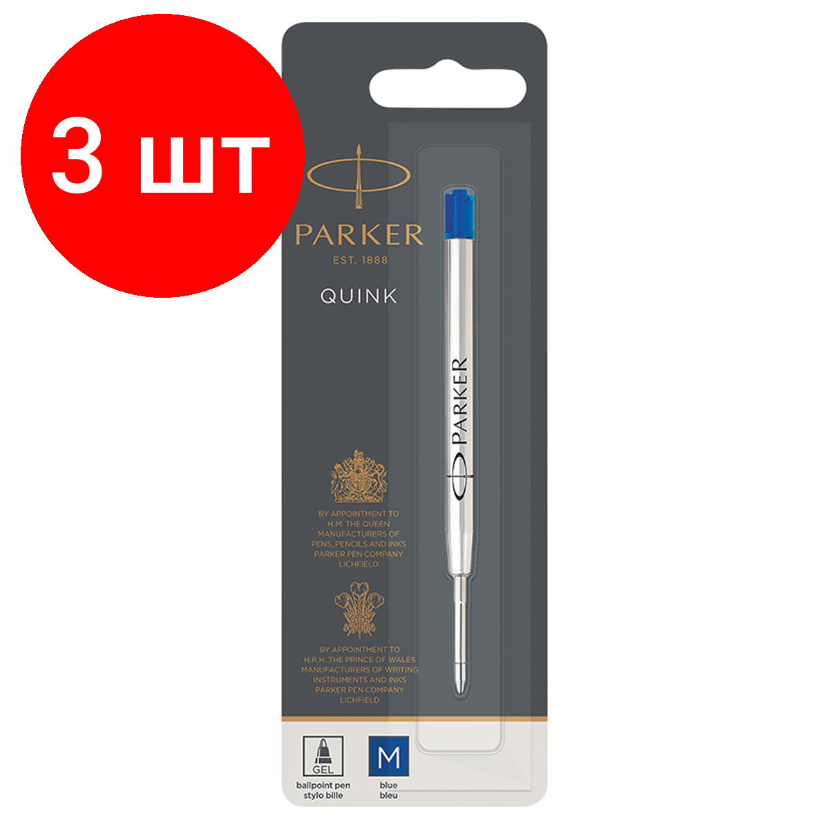 Стержни Parker для шариковой ручки 3шт. Цвет синий, толщина линии М, в блистере. Франция