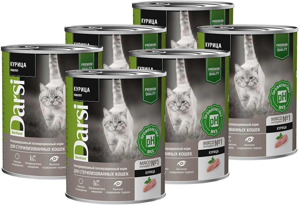Влажный корм Darsi для стерилизованных кошек паштет, Курица 6*340 г (6 банок)