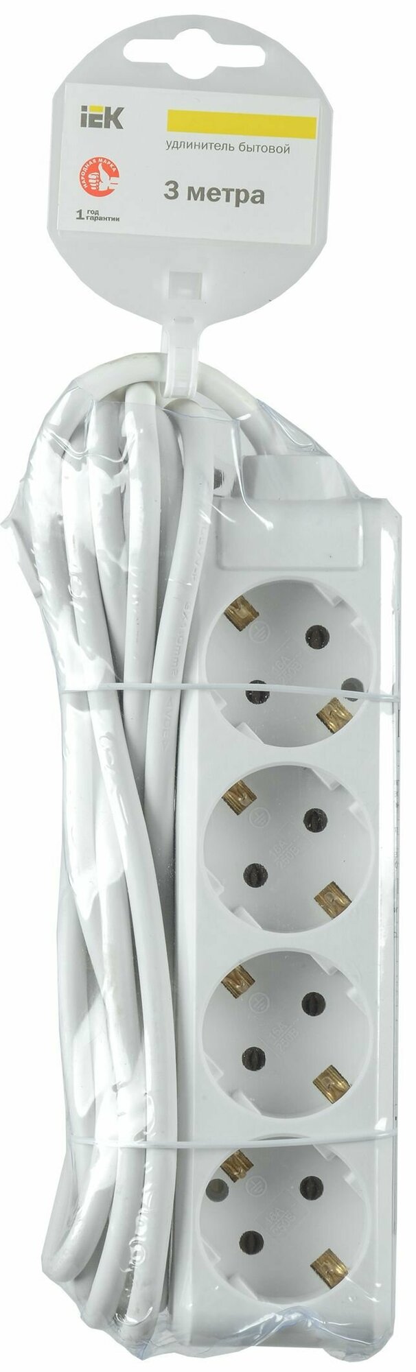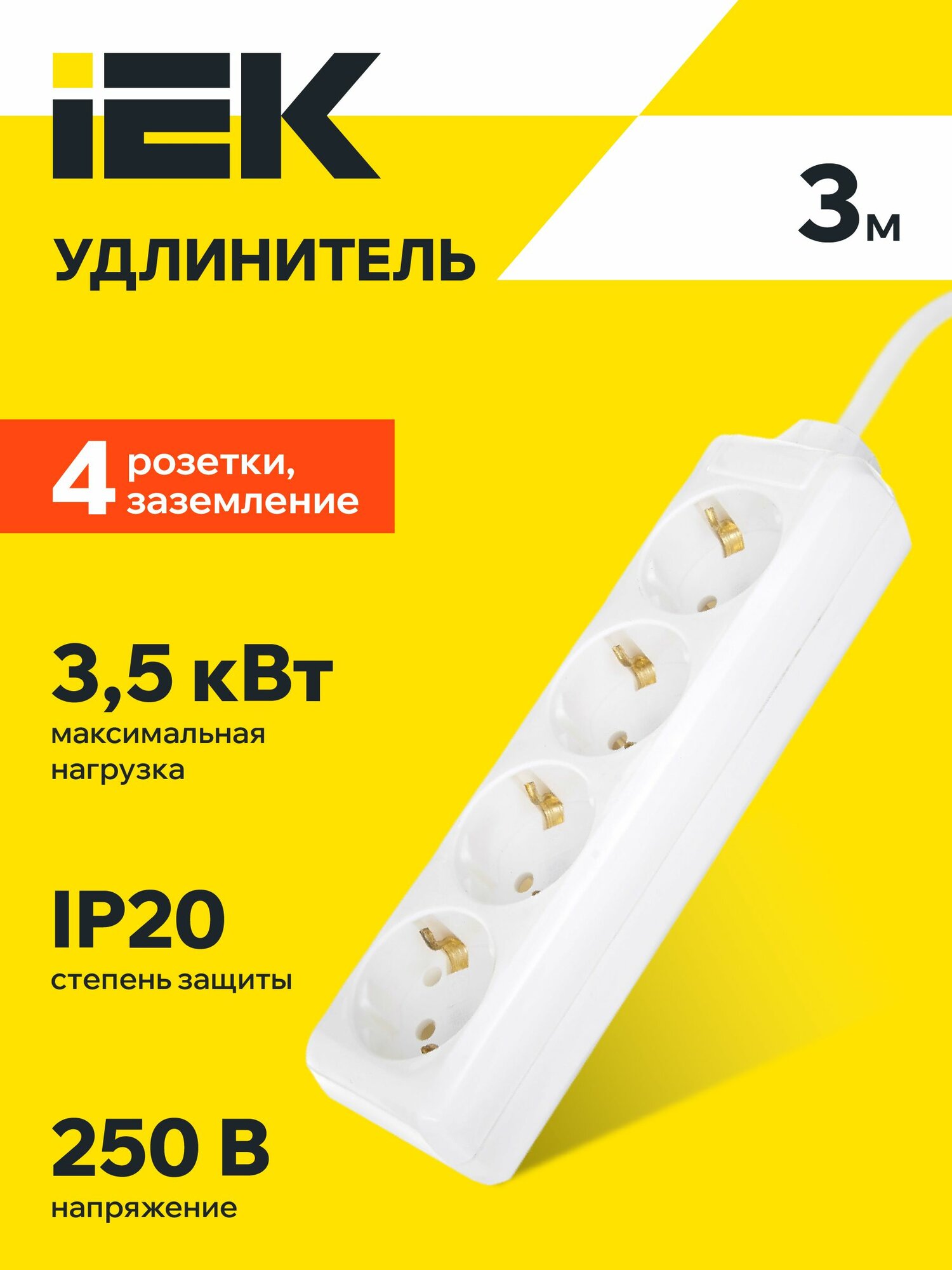 Удлинитель IEK У04, ПВС 3 x 1 мм², с заземлением, 4 розетки, 3 м, белый