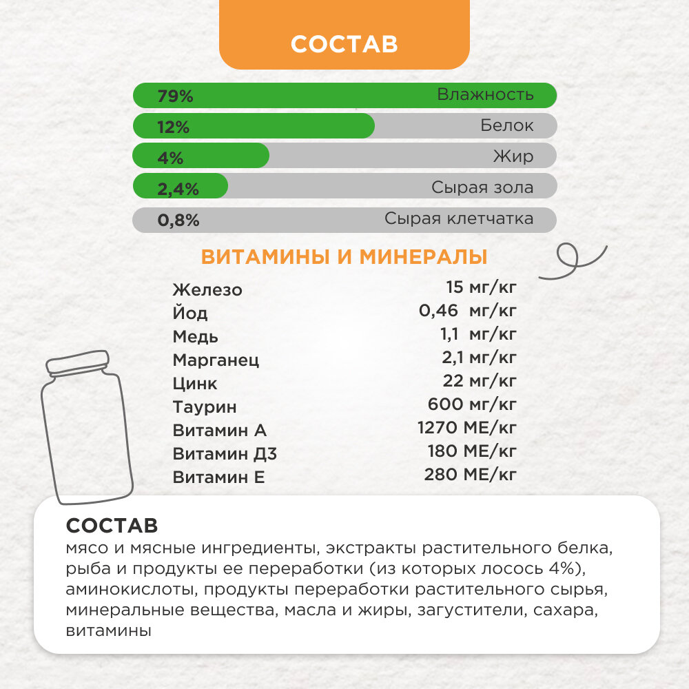 | Состав | мясо и продукты переработки мяса, экстракты растительных белков, рыба и продукты переработки рыбы (в том числе лосось 4%), растительные и животные жиры, минеральные вещества, красители, антиоксиданты, сахара, продукты переработки растительного сырья, витамины |