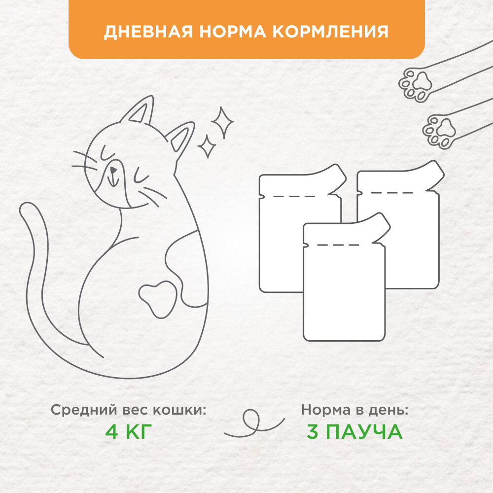 | Дозировка | для взрослой кошки среднего веса (4 кг) требуется 3 пакетика в день, разделенных на два кормления |