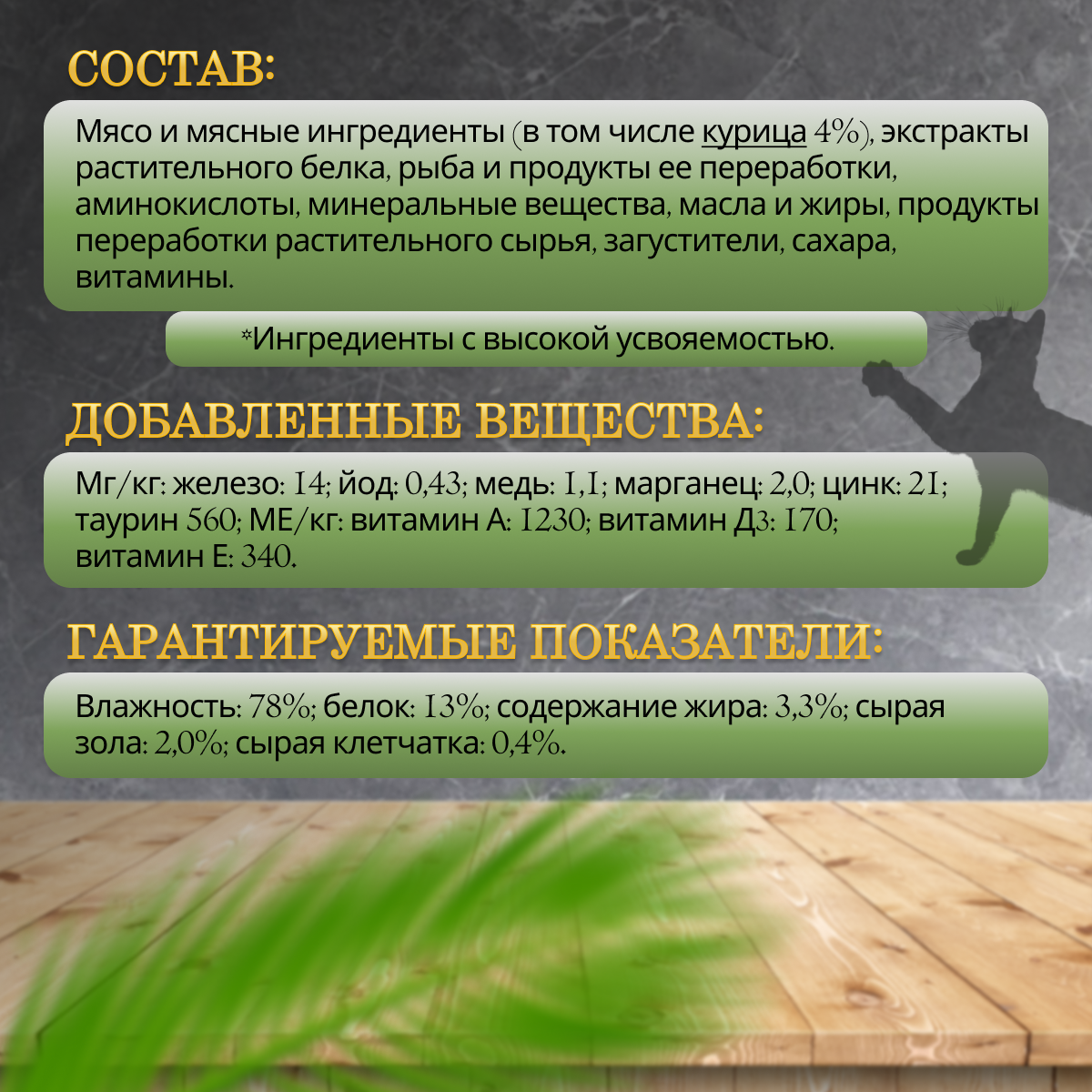 | Состав | мясо и продукты переработки мяса (в том числе индейка 4%), экстракты растительных белков, рыба и продукты переработки рыбы, продукты переработки растительного сырья, минеральные вещества, растительные и животные жиры, красители, сахара, витамины |
