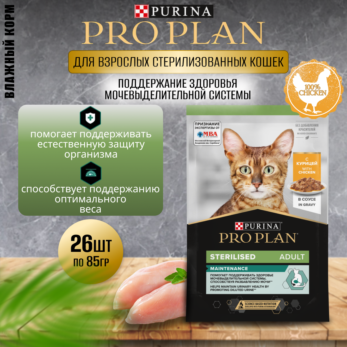 СохранитьВлажный корм для для стерилизованных кошек и кастрированных котов Pro Plan с курицей в соусе 26 шт х 85г интересное: