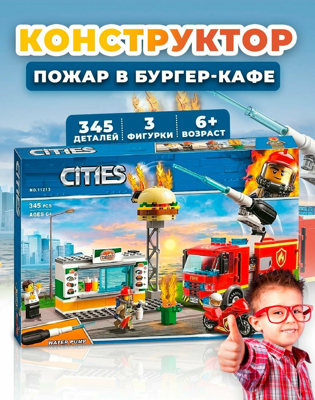 Конструктор Cities Сити "Пожар в бургер-кафе" 11213 / Конструктор для детей / Пластиковый конструктор Cities 345 деталей