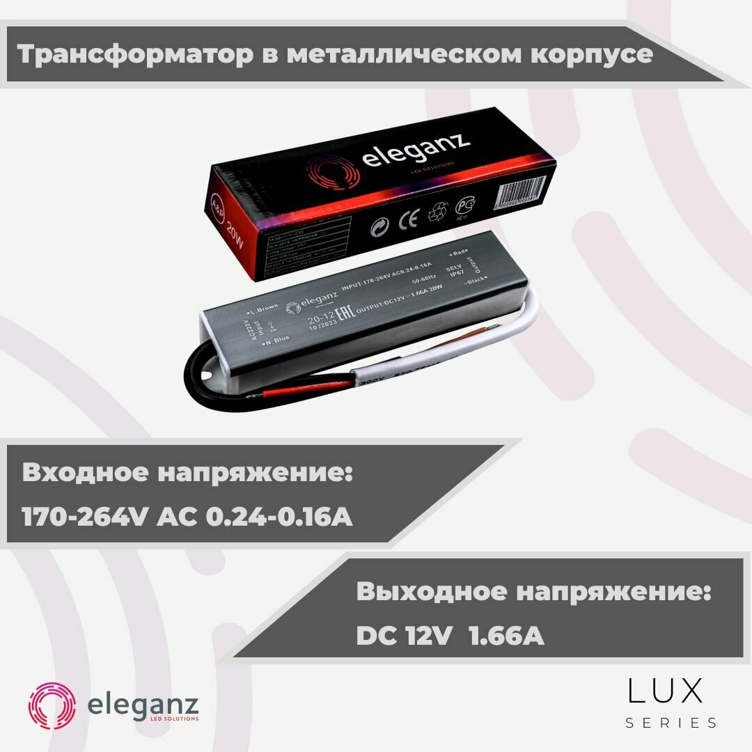 Ниже Вы можете прочитать отзывы на Герметичный блок питания/трансформатор (металлический корпус) "Eleganz 20Вт" для светодиодной ленты 12В IP67, ознакомится с подробными характеристиками, посмотреть интересные обзоры и фотографии на Герметичный блок питания/трансформатор (металлический корпус) "Eleganz 20Вт" для светодиодной ленты 12В IP67.