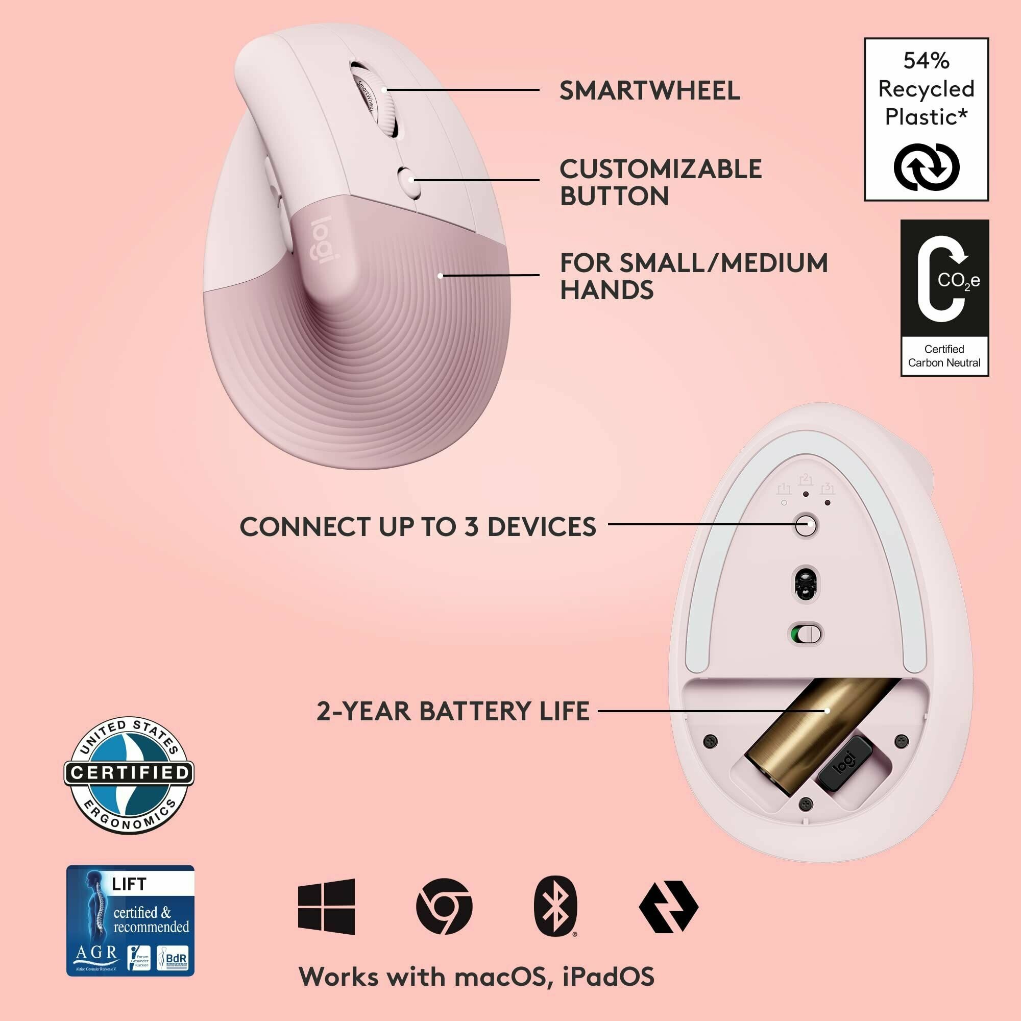 Беспроводная вертикальная мышь Logitech Lift, розовая