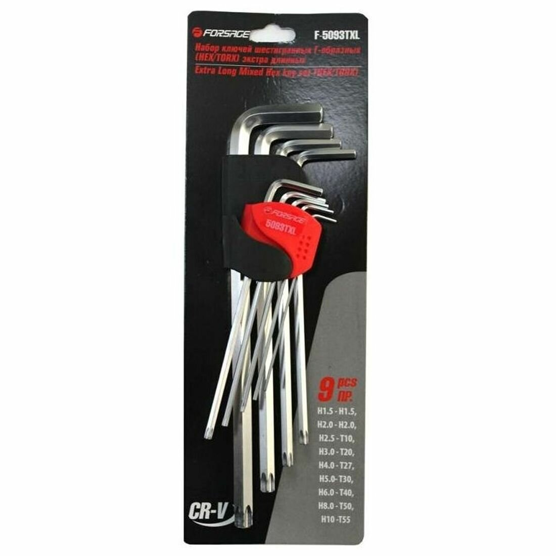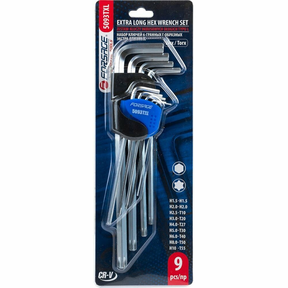 Набор ключей шестигранных 9 пр.HEX/TORX, экстрадлинных (Hex: 1.5, 2, 2.5, 3, 4, 5, 6, 8, 10, Torx: T10, T20, T27, T30, T40, T50, T55) Forsage F-5093TXL