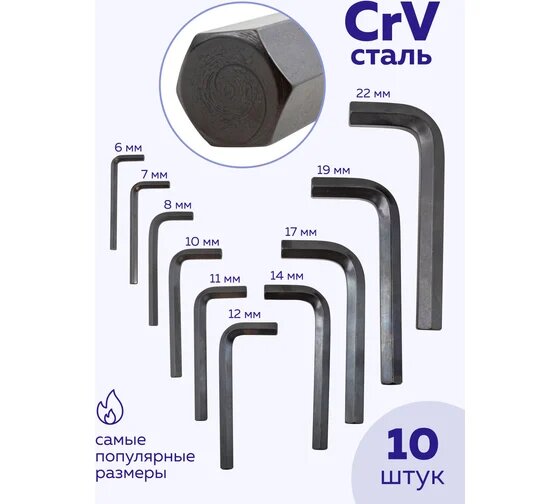 | Ключи имбусовые подробно | 6, 7, 8, 10, 11, 12, 14, 17, 19, 22 мм |