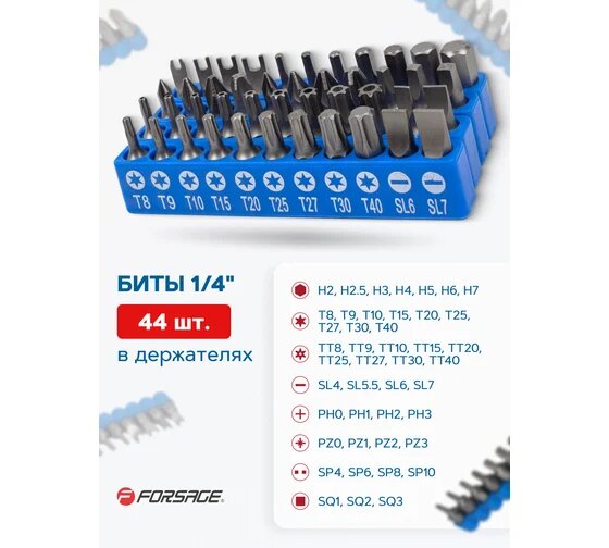 | Головки торцевые подробно | 1/4": 4, 4.5, 5, 5.5, 6, 7, 8, 9, 10, 11, 12, 13, 14 мм; длинные 1/4": 3, 4, 5, 6, 7, 8, 10 мм; Torx 1/4": E4, E5, E6, E7, E8, E10; с битами 1/4": T8, T10, T15, T20, T25, T27, T30, T40, SL4, SL5.5, SL6.5, PH1, PH2, PH3, PZ1, PZ2, PZ3 |