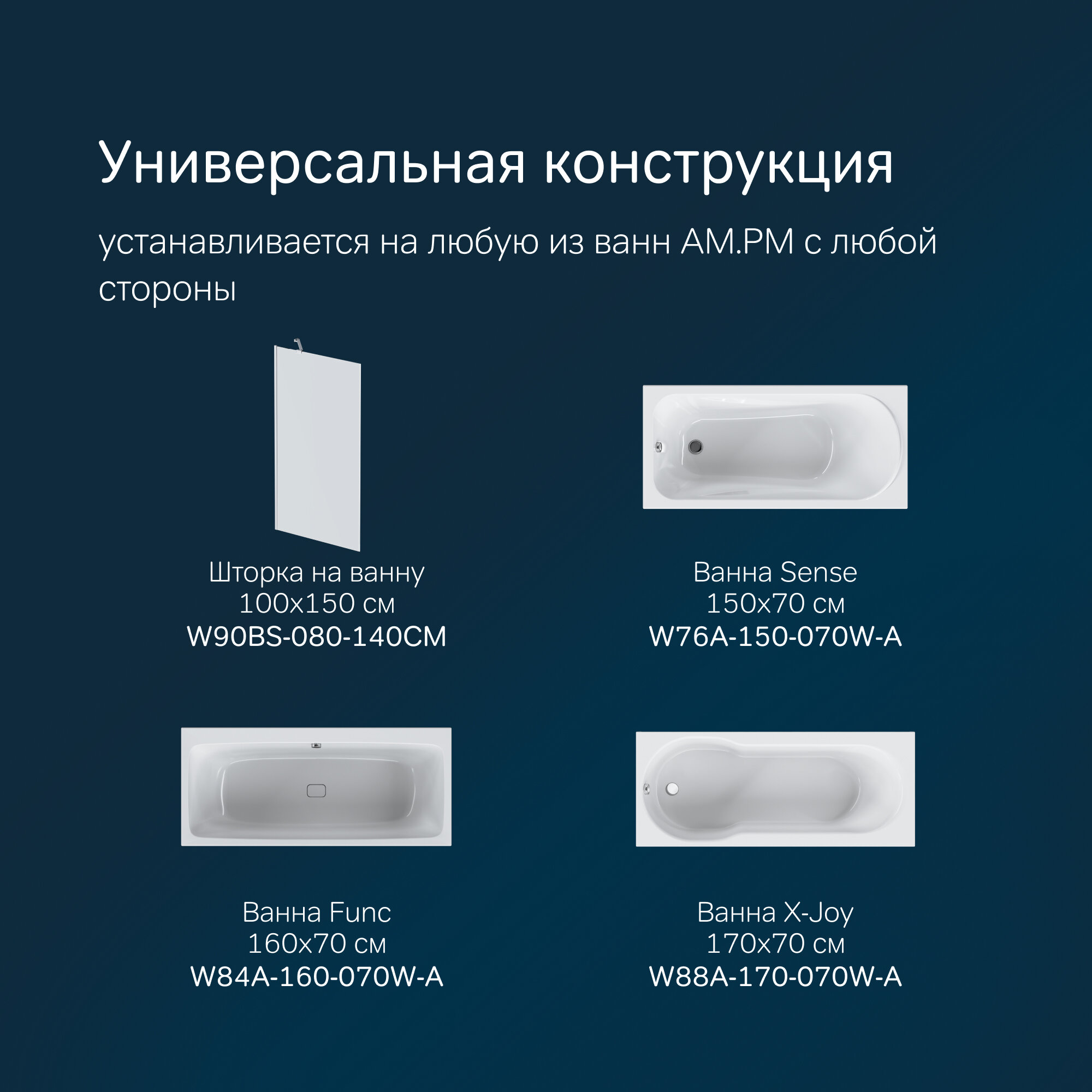 Шторка для ванны фиксированная AM.PM Gem W90BS-080-140CM