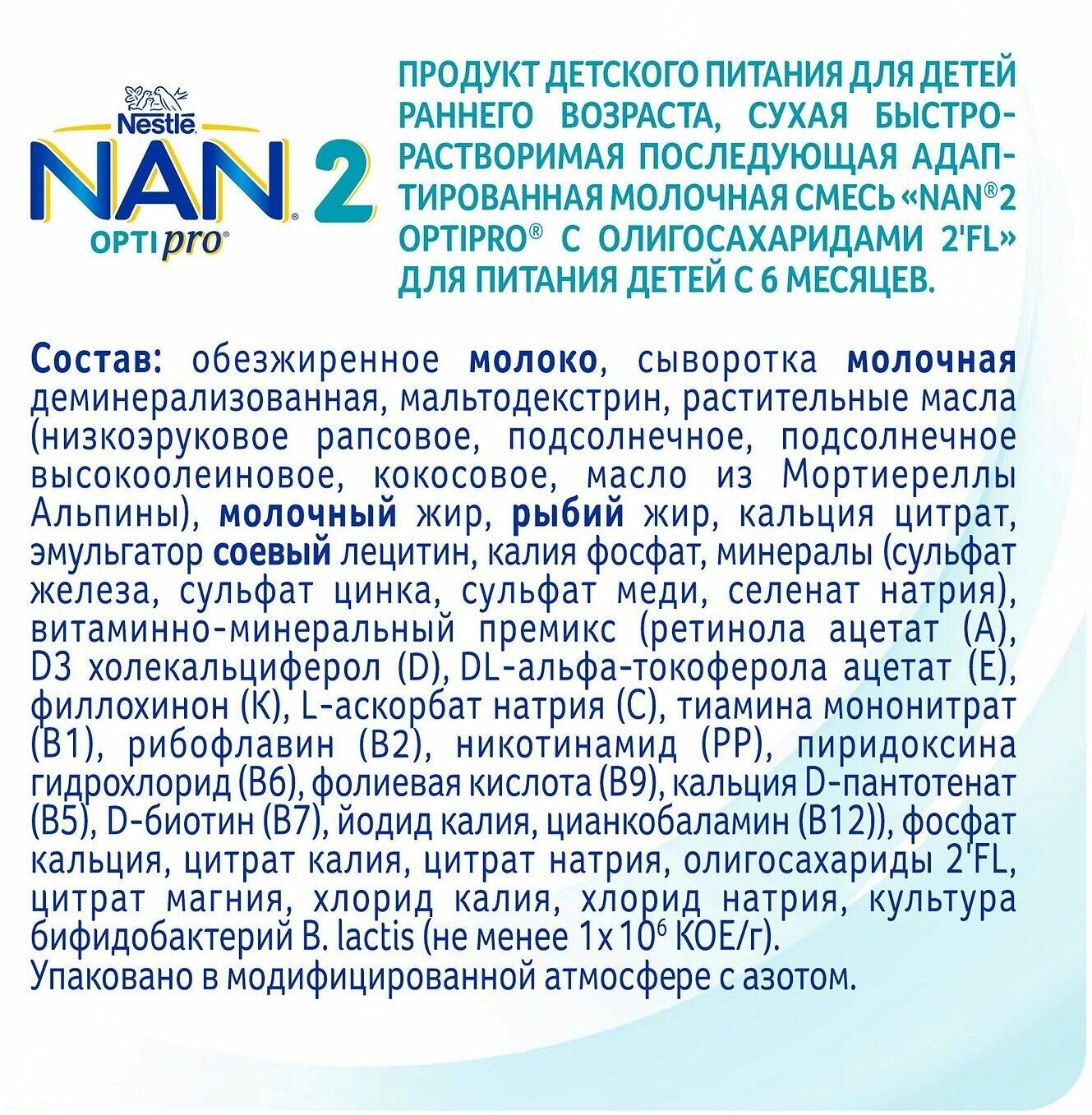 | Состав | обезжиренное молоко, сыворотка молочая деминерализованная, мальтодекстрин, растительные масла (низкоэруковое рапсовое, подсолнечное, подсолнечное высокоолеиновое, кокосовое, масло из Мортиереллы Альпины), молочный жир, рыбий жир, кальция цитрат, эмульгатор соевый лецитин, калия фосфат, минералы (сульфат железа, сульфат цинка, сульфат меди, селенат натрия), витаминно-минеральный премикс (ретинола ацетат (А), D3 холекальциферол (Д), DL-альфа-токоферола ацетат (Е), филлохинон (К), L-аскорбат натрия (С), тиамина мононитрат (В1), рибофлавин (В2), никотинамид (РР), пиридоксин гидрохлорид (В6), фолиевая кислота (В9), кальция D-пантотенат (B5), D-биотин (В7), йодид калия, цианкобаламин (В12)), фосфат кальция, цитрат калия, цитрат натрия, олигосахариды 2’FL, цитрат магния, хлорид калия, хлорид натрия, культура бифидобактерий лактис (не менее 1х10^6 КОЕ/г) |