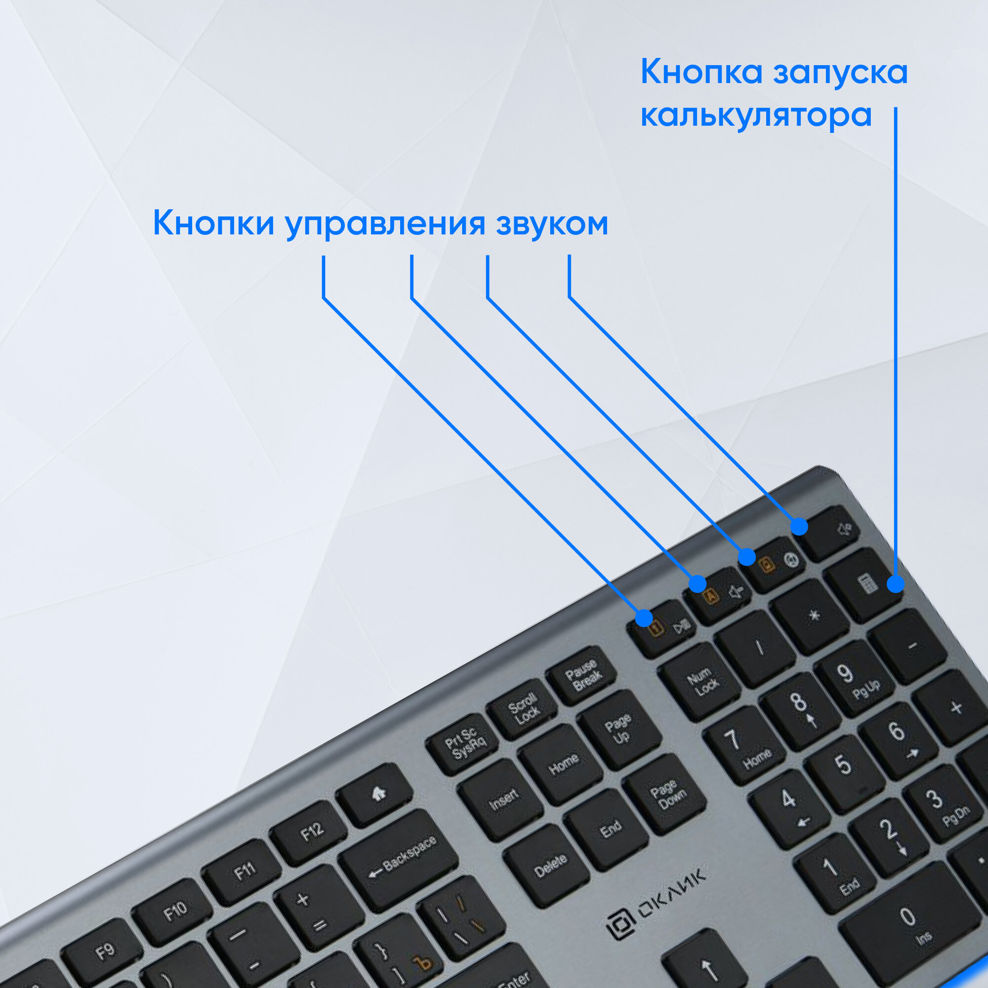 Клавиатура Оклик 890S серый/черный USB slim Multimedia, серебристый, 436.3x23x124.6мм.