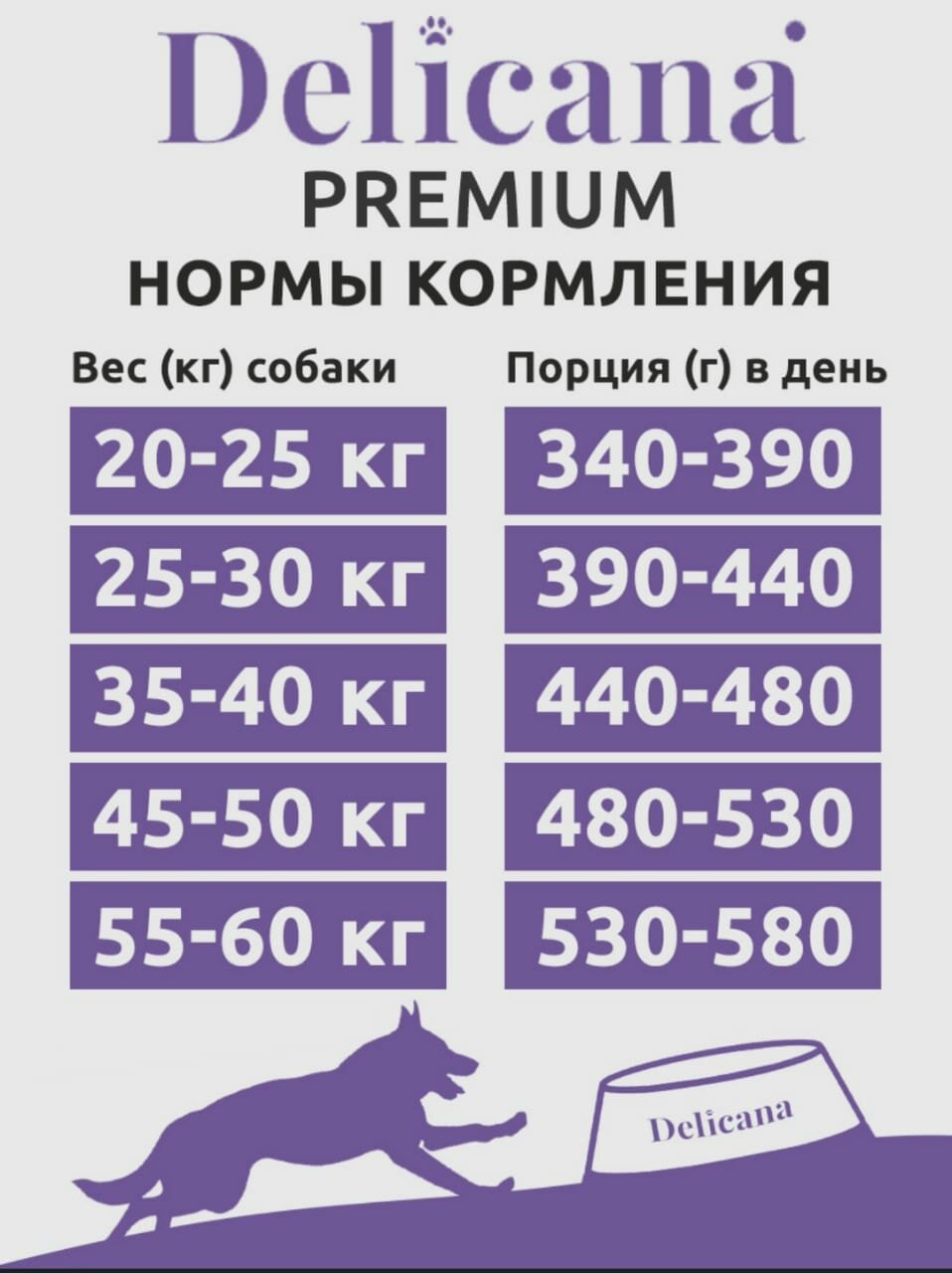 | Дозировка | - вес собаки 5-10 кг: 120-200 г/сут. - вес собаки 10-15 кг: 200-250 г/сут. - вес собаки 15-20 кг: 250-300 г/сут. - вес собаки 20-25 кг: 300-340 г/сут. - вес собаки 25-30 кг: 340-390 г/сут. |