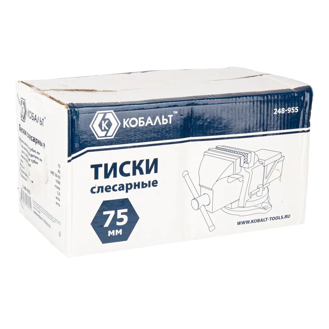 Тиски Кобальт слесарные поворотные стальные, ширина губок 75 мм, захват 75 мм, 5.7 кг, наковальня, коробка (248-955)