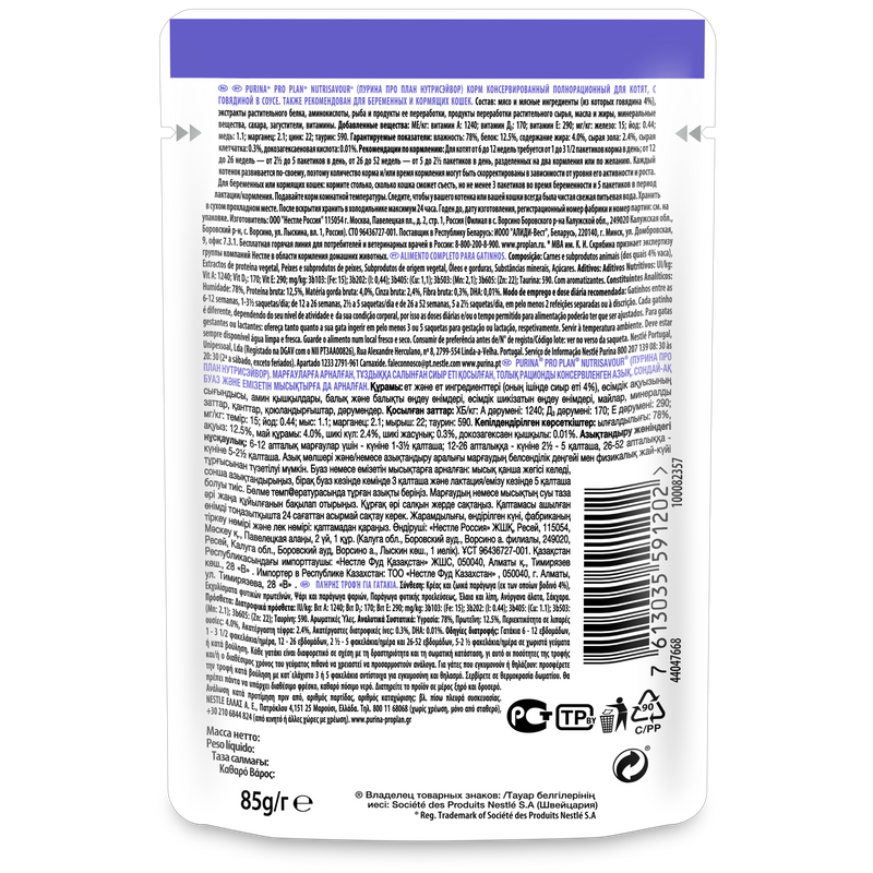 | Дополнительная информация | количество корма и/или время кормления могут быть скорректированы в зависимости от уровня его активности и роста; для беременных или кормящих кошек: кормите столько, сколько кошка сможет съесть, но не менее 3 пакетиков во время беременности и 5 пакетиков в период лактации/ кормления; подавайте корм комнатной температуры; следите, чтобы у вашей кошки всегда была чистая свежая питьевая вода |