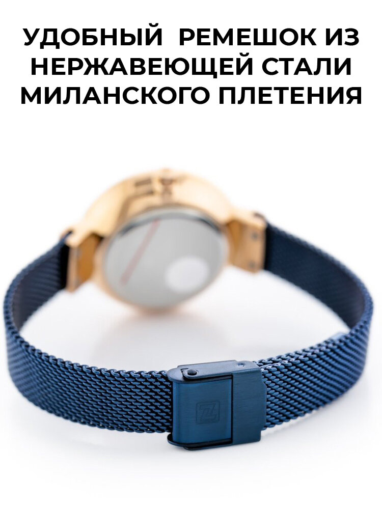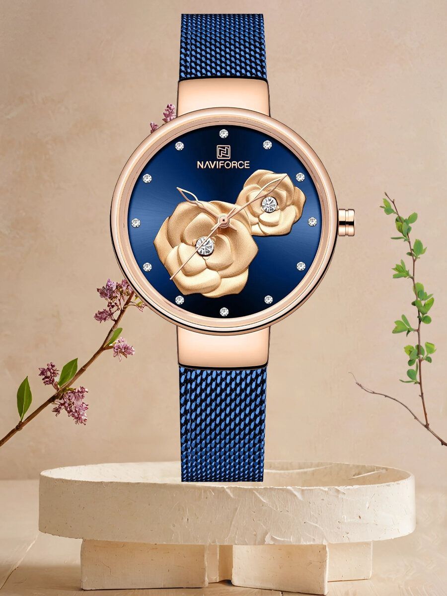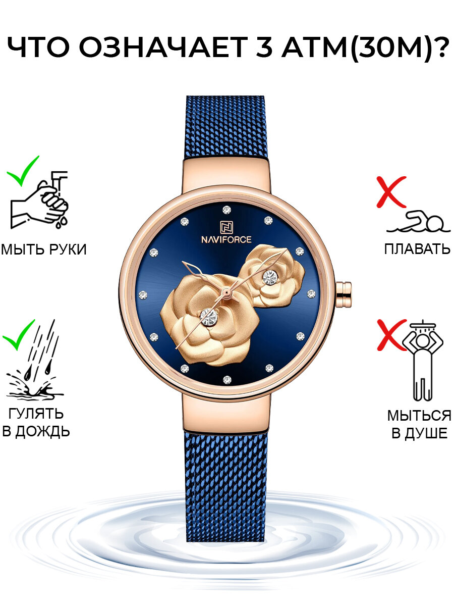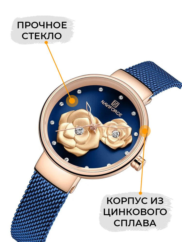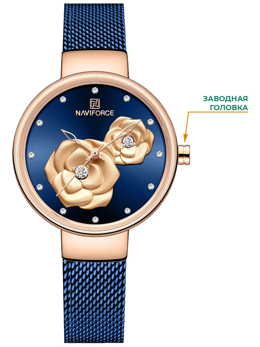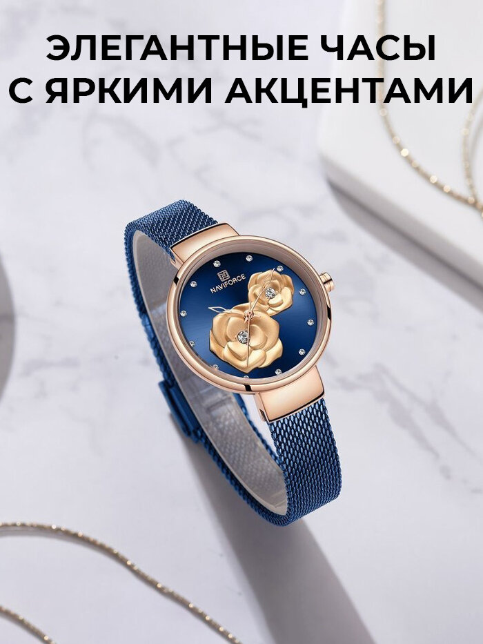 Часы наручные женские кварцевые Naviforce металлические, круглые, синие/золотистые интересное: