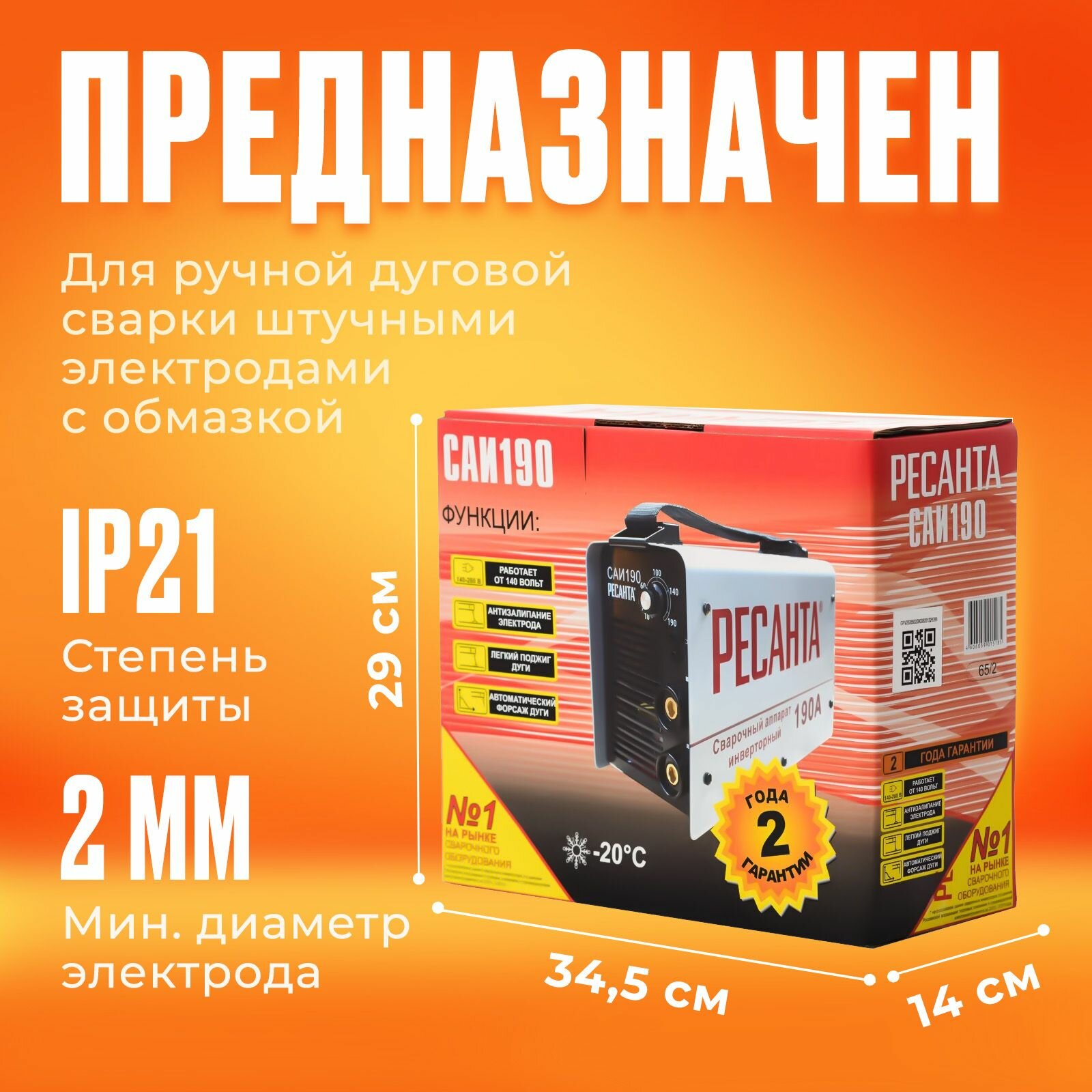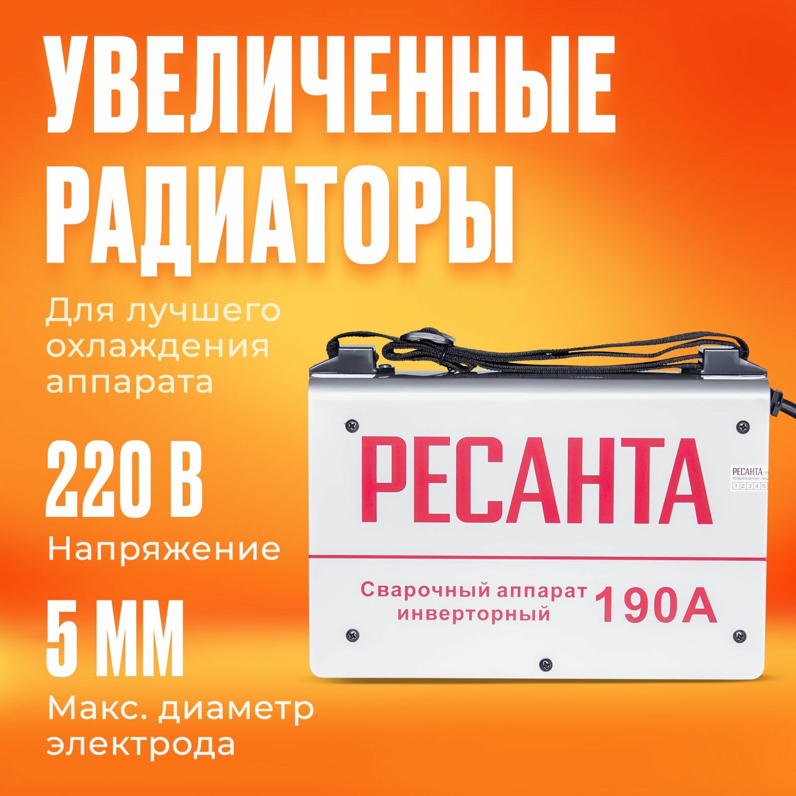 Сварочный аппарат инверторный, сварочный ток до 190 А, диаметр электрода до 5 мм, РЕСАНТА САИ 190, 65/2 интересное: