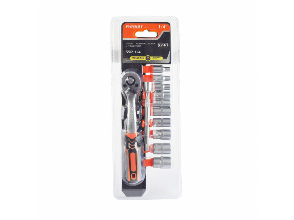 Набор торцовых головок PATRIOT SSR-1/2, CrV сталь, трещотка, удлинитель, 12 предм.Тороцовые головки 10 шт: 10,11,12,13,14,15,17,19,22,24мм удлинитель 125мм 1шт трещотка 72 зуба 1 шт