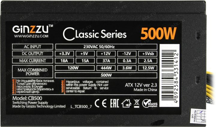 Блок питания Ginzzu CB500 ATX,12CM,20+4p, CPU(4+4), PCI-E(6+2p), 4*SATA, 3*IDE, кабель питания
