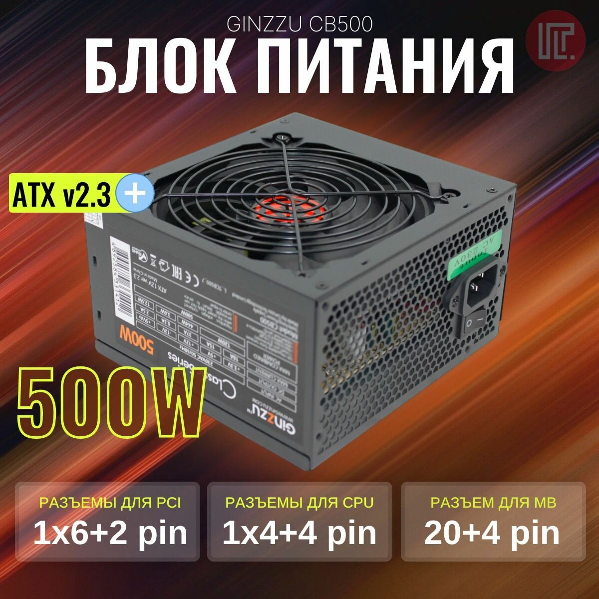 Блок питания Ginzzu 500W (CB500) ATX,12CM,20+4p,CPU(4+4), PCI-E(6+2p), 4*SATA, 3*IDE, кабель питания