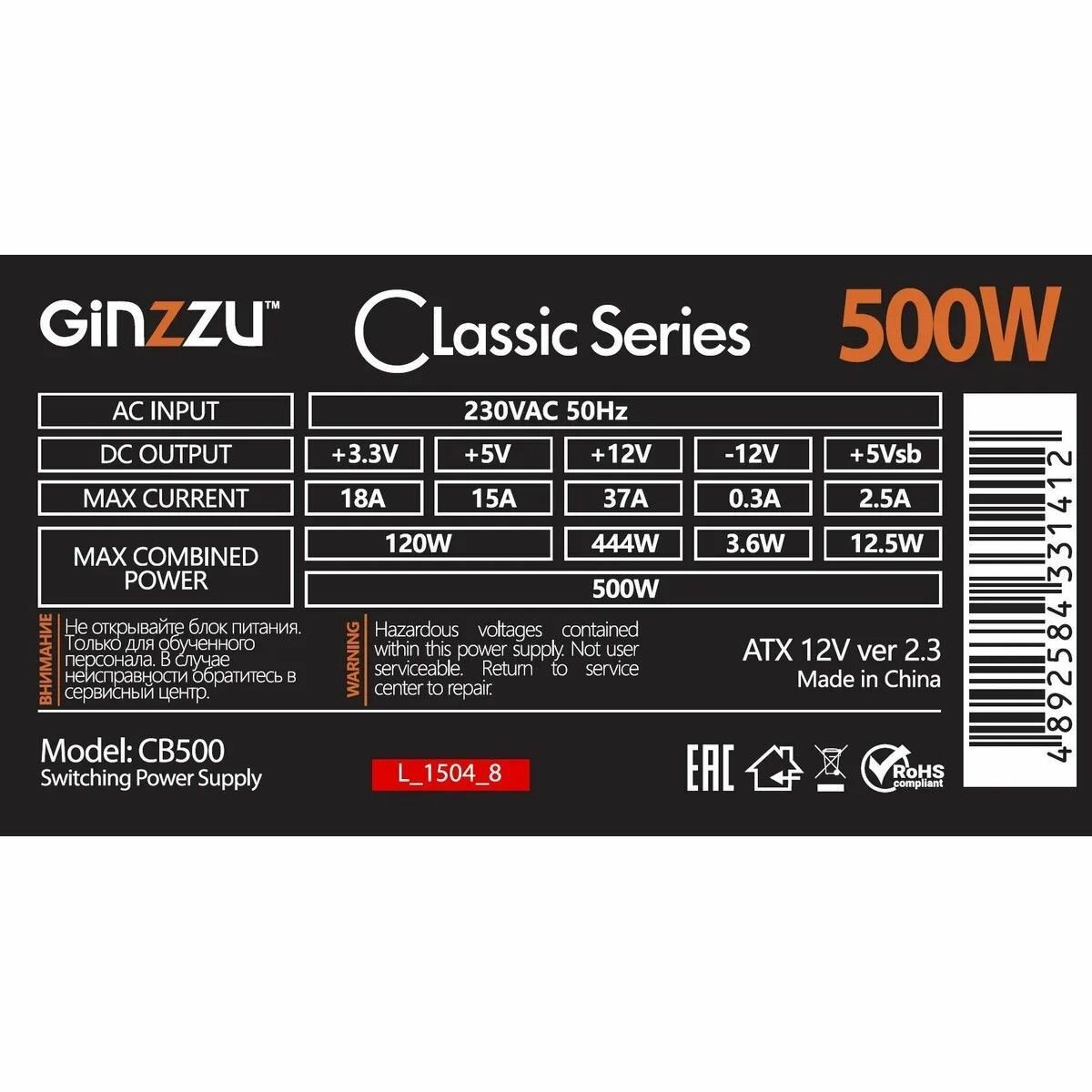 Блок питания Ginzzu 500W (CB500) ATX,12CM black,20+4p,CPU(4+4)