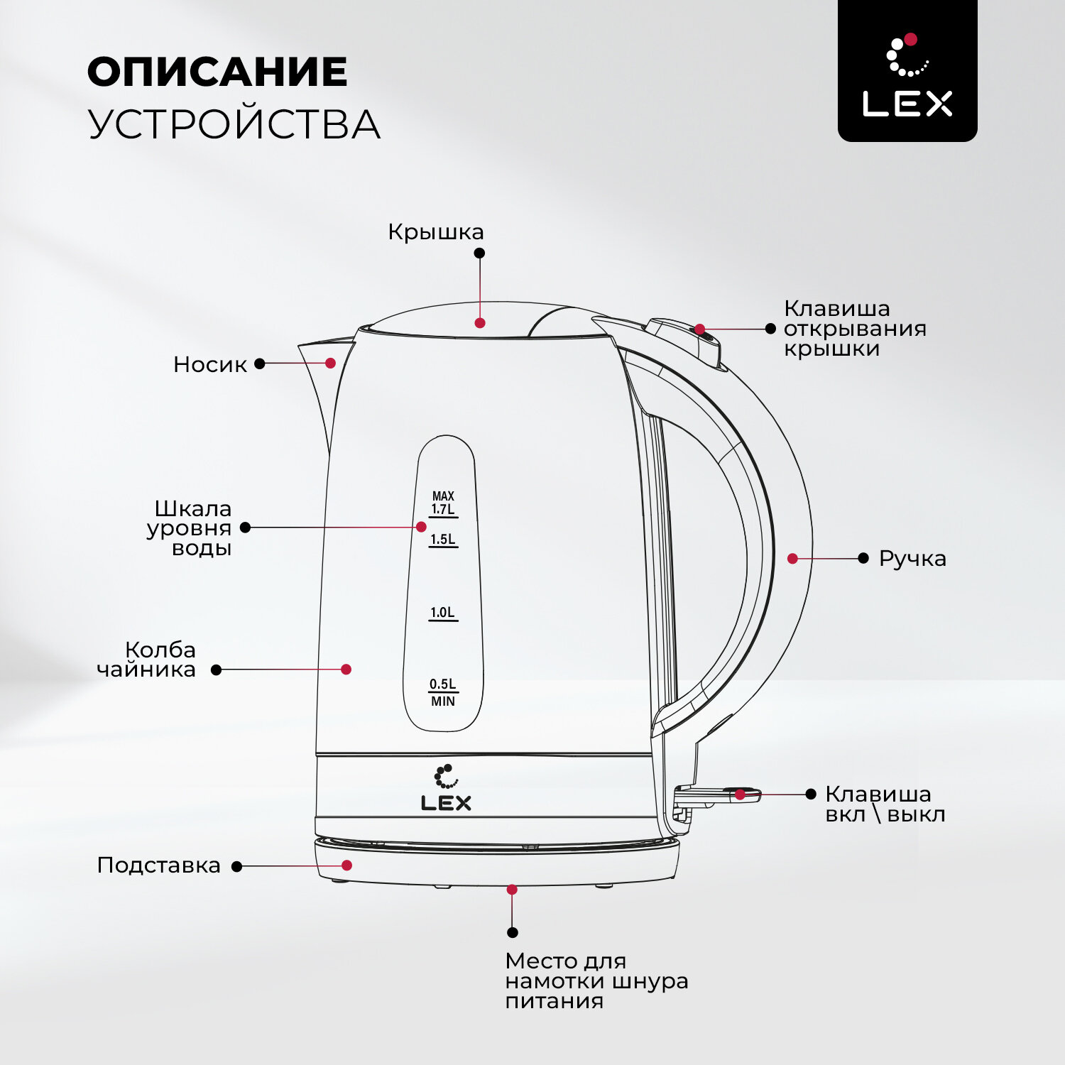 Купить Электрический чайник LEX LX 30028-3, материал пищевой пластик, объем 1,7л, плавное открывание крышки, блокировка включения без воды, защита от перегрева.
