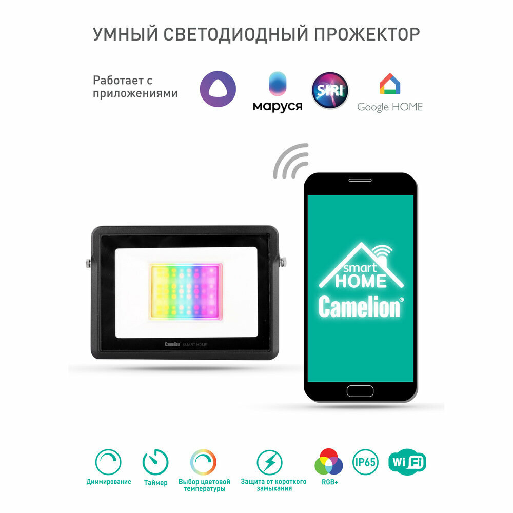 Умный светодиодный LED SMD прожектор 30Вт 14744 Camelion Smart home LFL/SH-30/RGBCW/WIFI Camelion Smart Home LFL/SH-30/RGBСW/WIFI Wi-Fi Голосовое управление