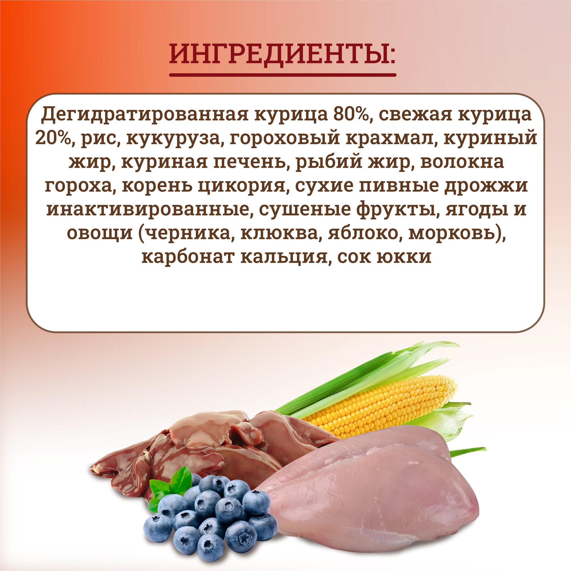 | Состав | океаническая рыба (50%) (дегидратированная океаническая рыба - 80%, свежая океаническая рыба – 20%), бурый рис, гороховый крахмал, рыбий жир, растительные волокна гороха, гидролизат белка рыбы, корень цикория (источник инулина и фруктоолигосахаридов), сухие инактивированные пивные дрожжи (источник маннанолигосахаридов), сушеные фрукты, ягоды и овощи (черника - 0,40%, клюква - 0,40%, яблоко - 0,20%, морковь - 0,20%), карбонат кальция, сок юкки |