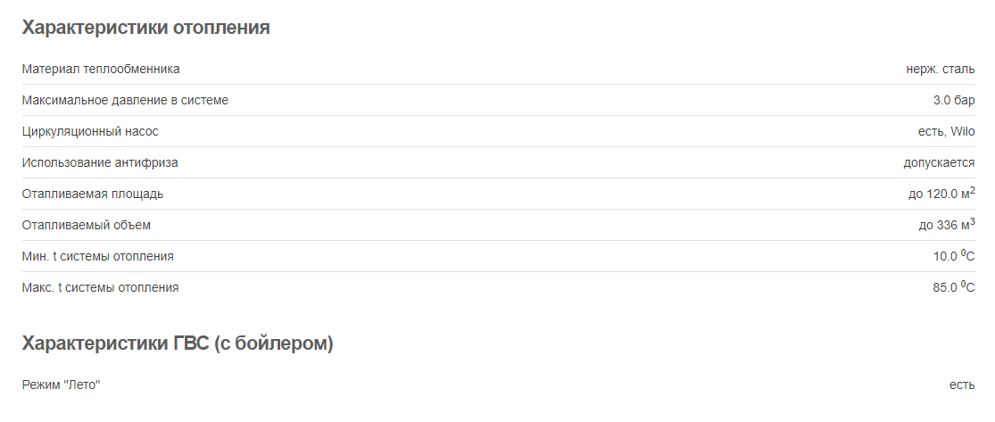 | Особенности | воздухоотводчик, встроенный расширительный бак, встроенный циркуляционный насос, манометр, предохранительный клапан, разъем для подключения внешнего управления, термометр |