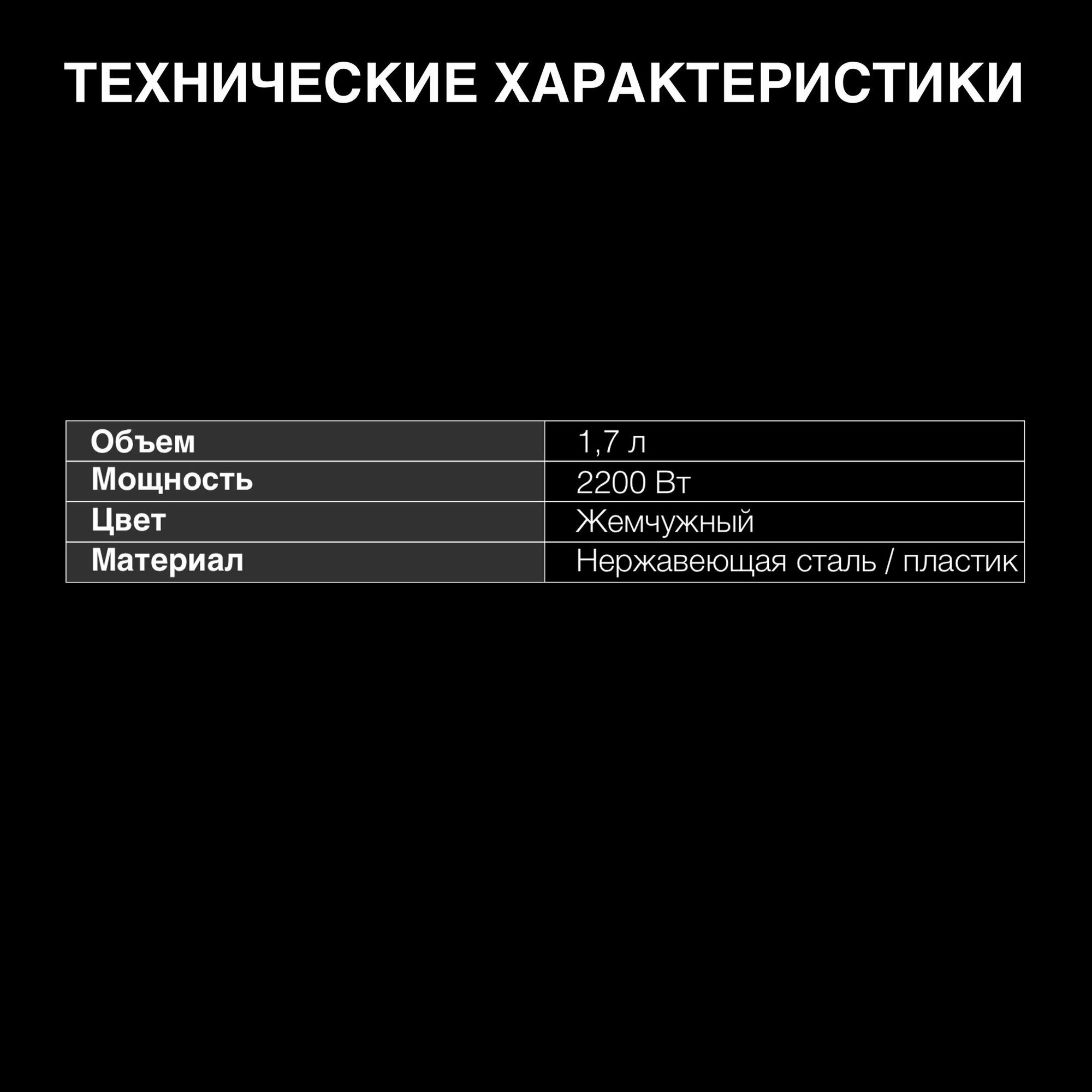 Электрический чайник Hyundai 1.7л. 2200Вт жемчужный/черный (корпус: нержавеющая сталь/пластик)