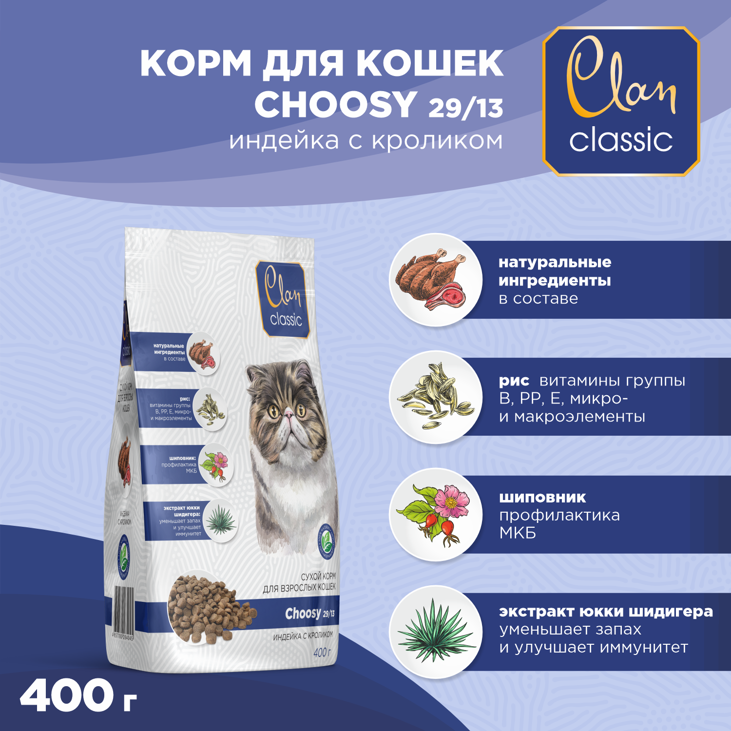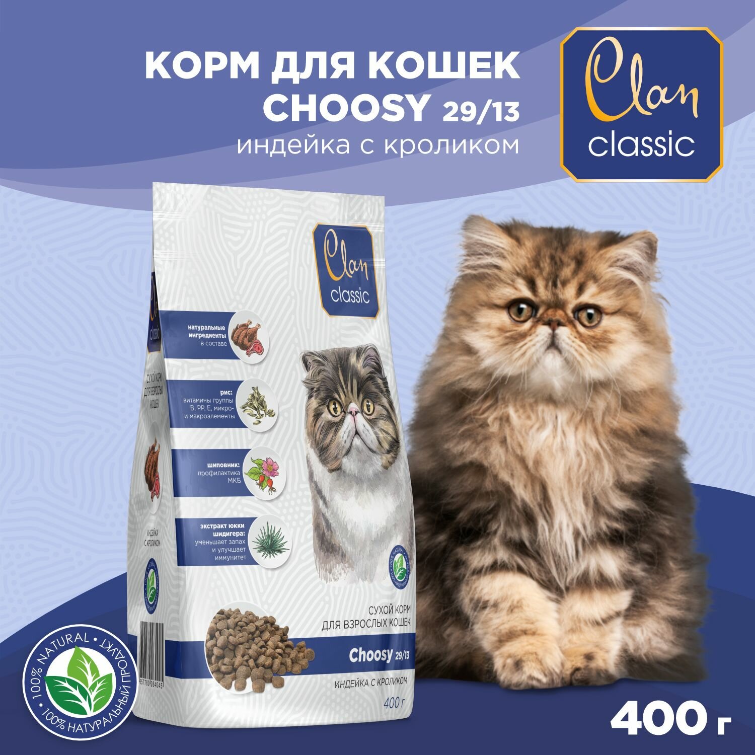Купить Корм для кошек сухой CLAN Classic Choosy 29/13 индейка и кролик, 400г