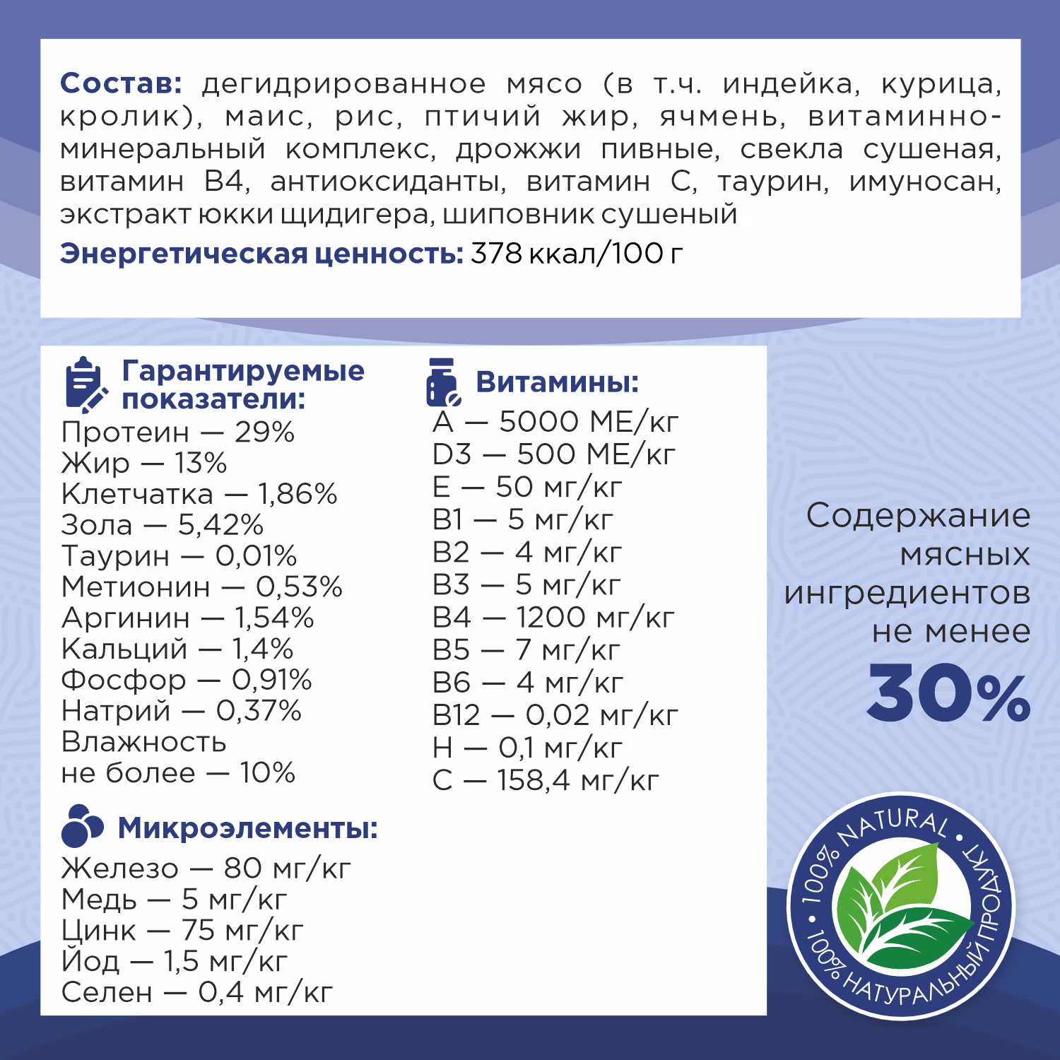 | Состав | Дегидрированное мясо атлантической рыбы, индейки, бурый рис (источник пищевых волокон), маис, птичий жир, сушеная мякоть сахарной свеклы (способствует улучшению работы ЖКТ), пивные дрожжи (натуральный источник пребиотиков MOS), натуральные вкусоароматические добавки, рыбий жир, клюква, таурин, экстракт Юкка Шидигера, натуральный антиоксидант. Содержание мясных ингредиентов не менее 37% |