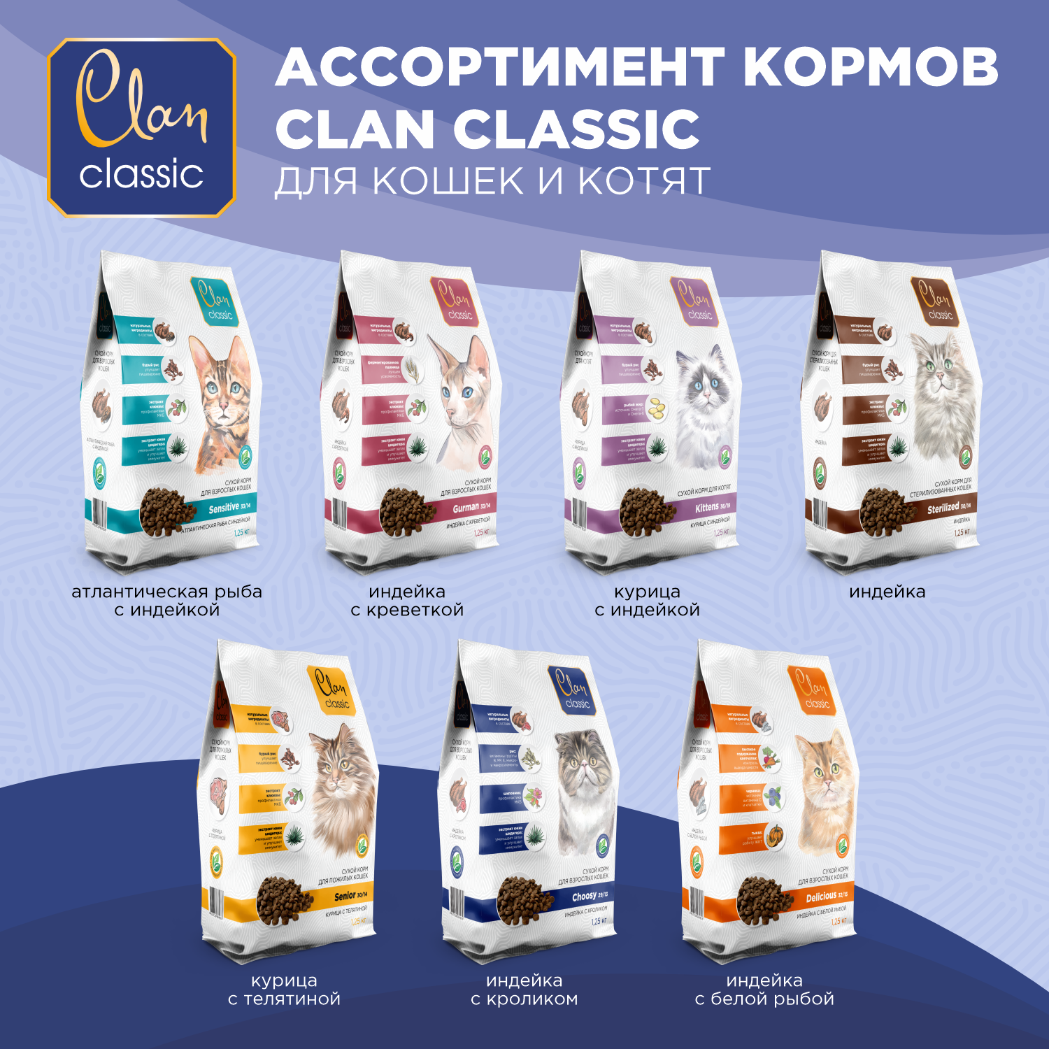 CLAN CLASSIC Delicious 32/15 корм сухой для кошек Индейка и Белая рыба 1.25кг